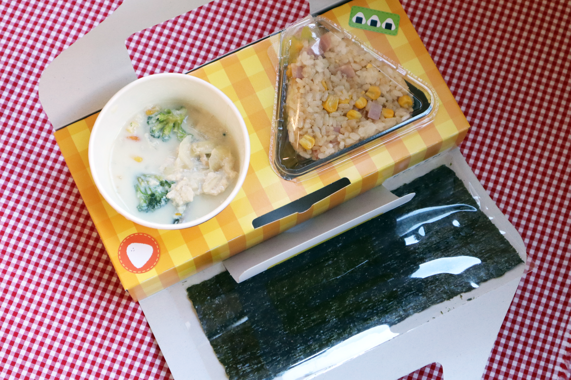 豆乳野菜スープ&おにぎり(ベーコン・コーンのバター風味)のセット販売。直営店「のりきっちんbyKOZEN」で展開