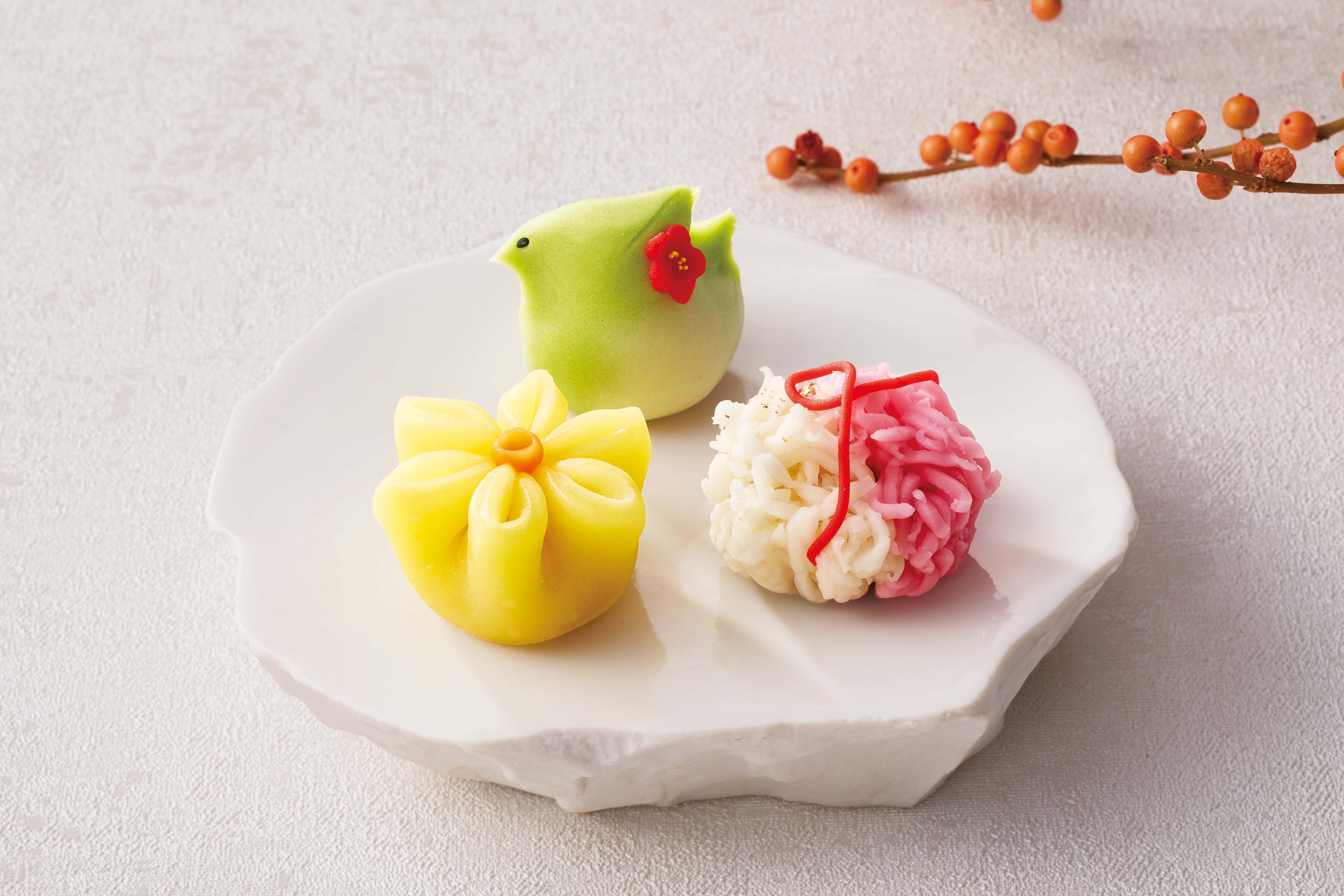 上生菓子(左から)「水仙」(外郎製)「初音」(練切製)「縁結び」(金団製)(各1個)