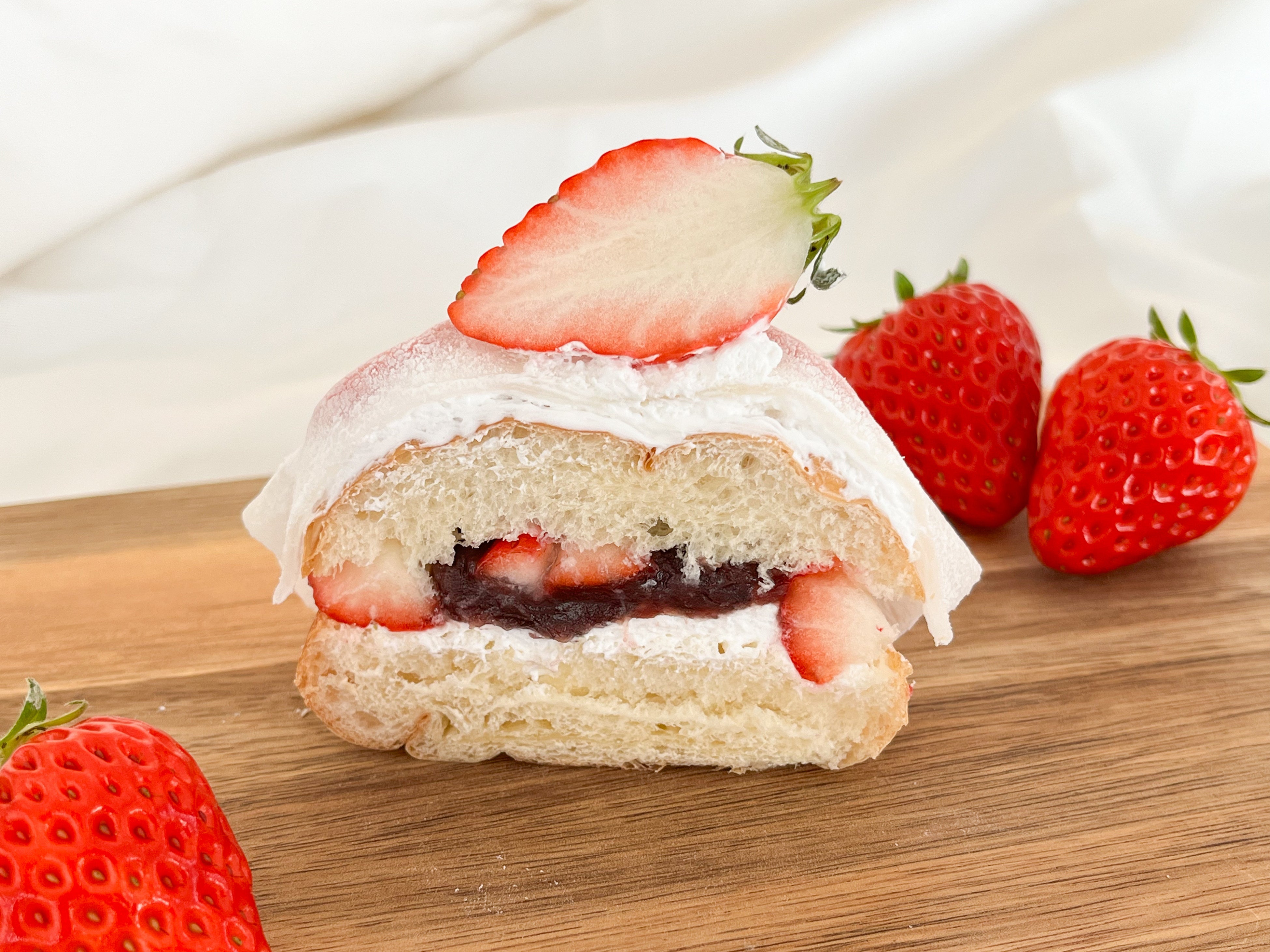 餡×クリーム×いちごのハーモニーと、モチフワな求肥がマッチした新感覚のクリームパンです。