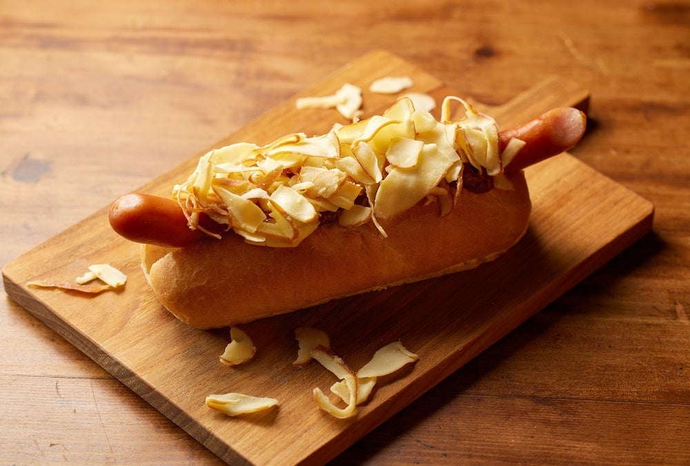 薄く削ったスモークチーズをたっぷりとトッピングしたホットドッグ。ピリ辛のサルサソースがアクセントになっています。
