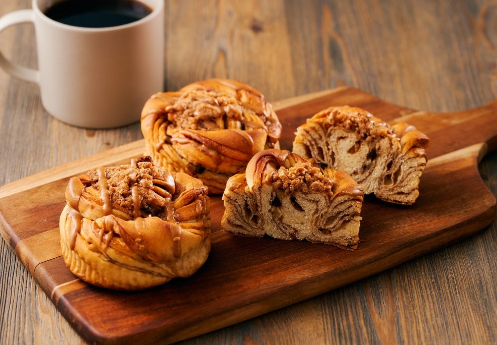 シナモンの風味豊かな生地に、ヘーゼルナッツの食感がアクセント。コーヒーとのペアリングをお楽しみください。