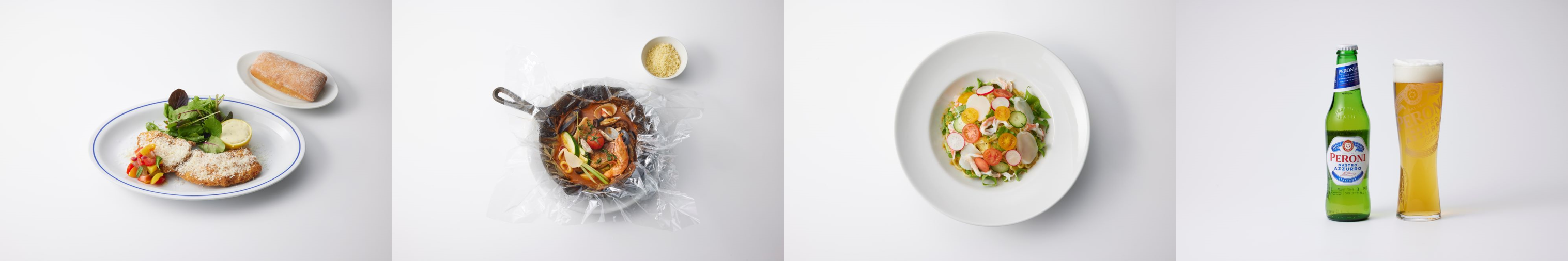 提供メニュー例 : 左から、豚ヒレ肉のカツレツ、白身魚と魚介のカルトッチョ、カニとホタテのカラスミバターパスタ、ペローニ ナストロアズーロ 樽生