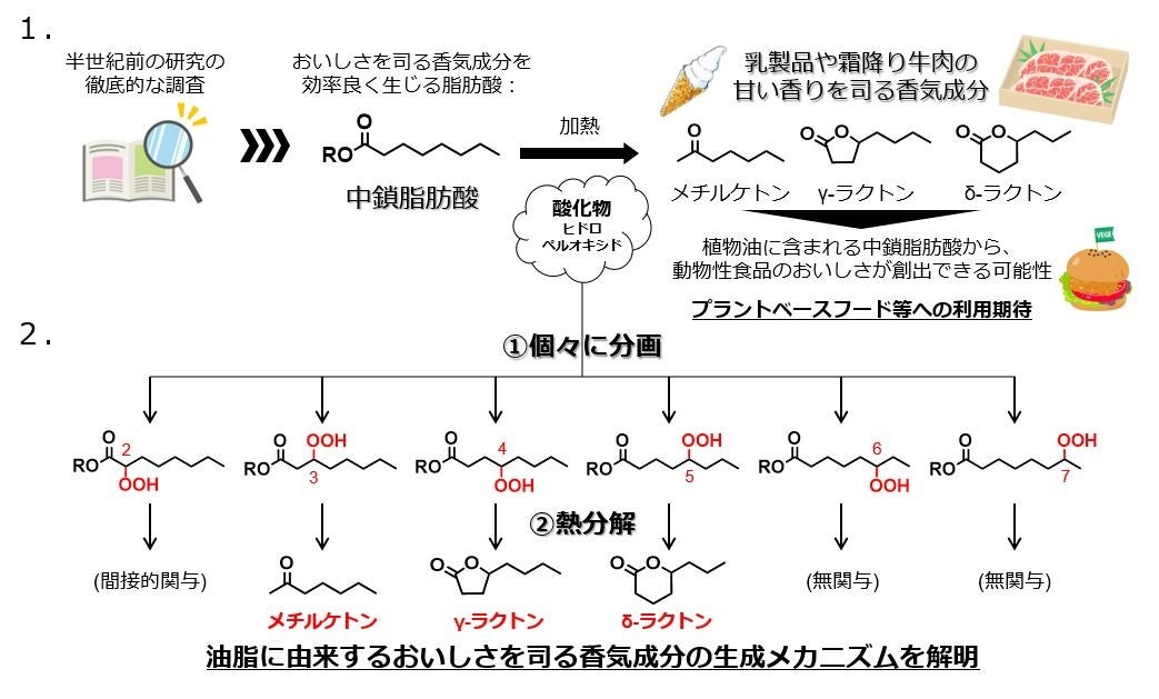 1.当研究グループは、50年以上前の研究を徹底的に調査し、飽和脂肪酸の中でも、長さが中程度のもの(中鎖脂肪酸)がおいしさを司る香気成分であるメチルケトンやラクトンを効率良く生じさせることができるという仮説を立てました。実際に中鎖脂肪酸を加熱したところ、いくつかの酸化物(ヒドロペルオキシド)ができました。さらにこの酸化物の分解により発生したと考えられる甘い香りを示す成分を分析したところ、その正体は確かにメチルケトンやラクトンであることが判明しました。