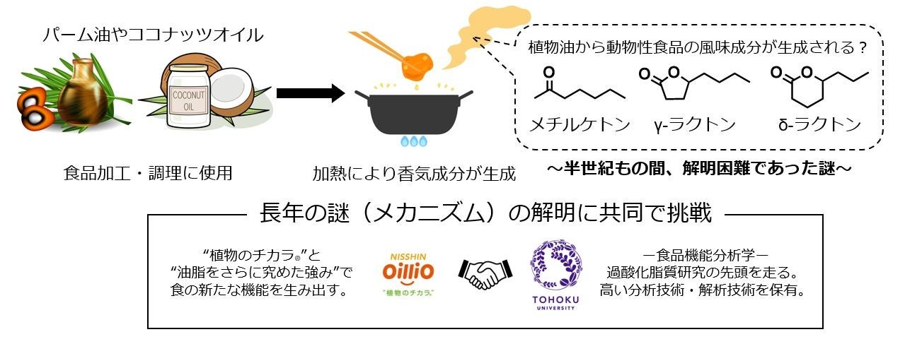 大豆油や菜種油等に多く含まれる不飽和脂肪酸は、光や高温等で比較的容易に酸化されることが知られています。これに対し、パーム油やココナッツオイル等に豊富に含まれる飽和脂肪酸は酸化されにくい特徴を持ちます。しかし実際は、飽和脂肪酸でもその一部が加熱の過程で酸化されることに加え、動物性食品のおいしさを司る香気成分であるメチルケトンやラクトン(乳製品や牛肉等に含まれる風味成分)を生成する可能性が示唆されていました。この香気成分の生成メカニズムの解明に向けた研究は、1980年頃までは断続的に行われてきましたが、その困難さのため、今日に至るまで途絶えていました。そこで当研究グループは、およそ半世紀ぶりにこのメカニズムを解明すべく、共同研究を実施しました。