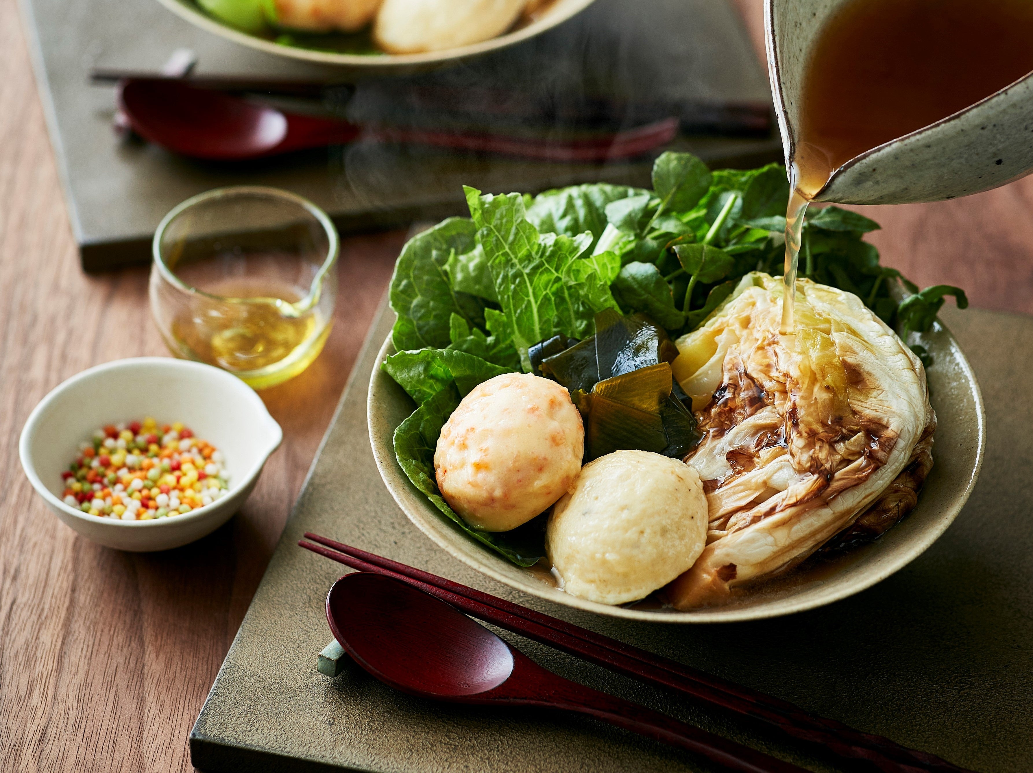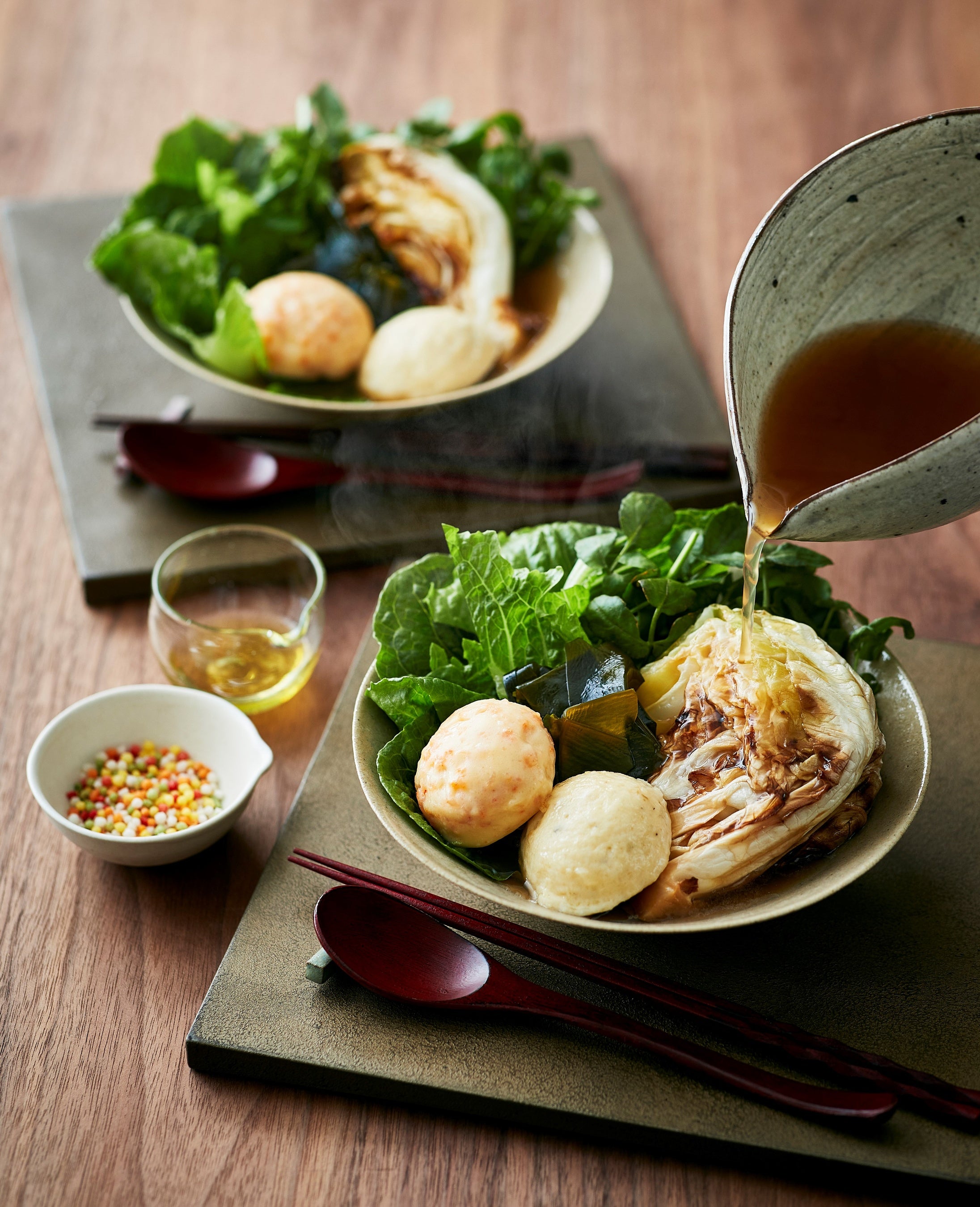 そしてもう一品。「貝だしで仕上げる 春野菜と二種しんじょうのさらだ椀」は、温かさと共に味わっていただくお椀仕立ての新感覚さらだ。鯛と海老、風味豊かな二種のしんじょう入りです。貝の旨みが詰まったおだしで味わったあとは、「あられ」で香ばしく、「生姜オイル」でキリっとした風味に、味変もお楽しみください。