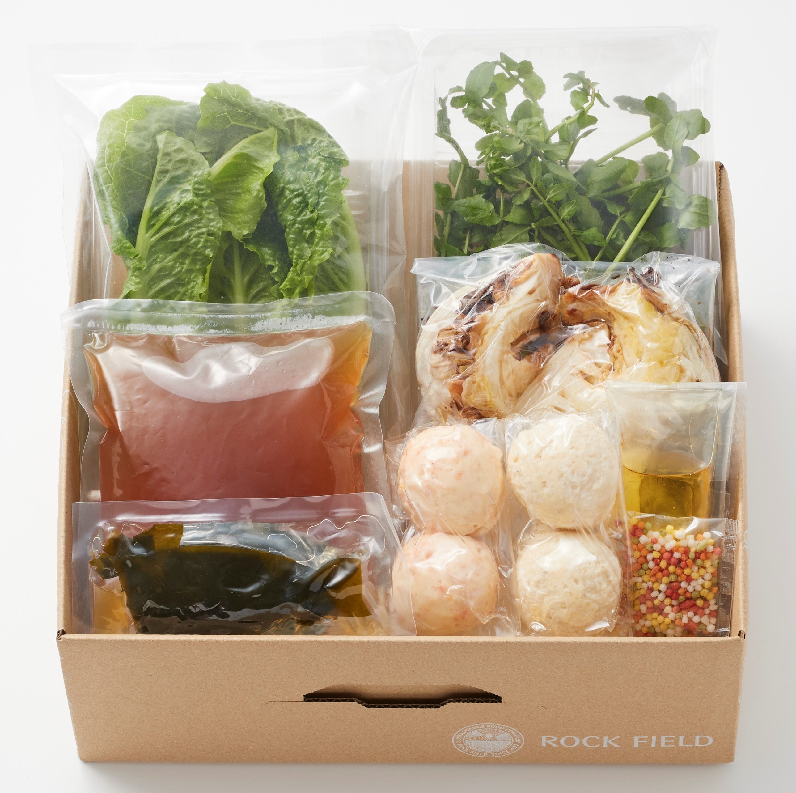 セット内容:鰹貝だし/焼きキャベツ/わかめ/鯛しんじょう/海老しんじょう/ロメインレタス/クレソン/あられ/生姜オイル