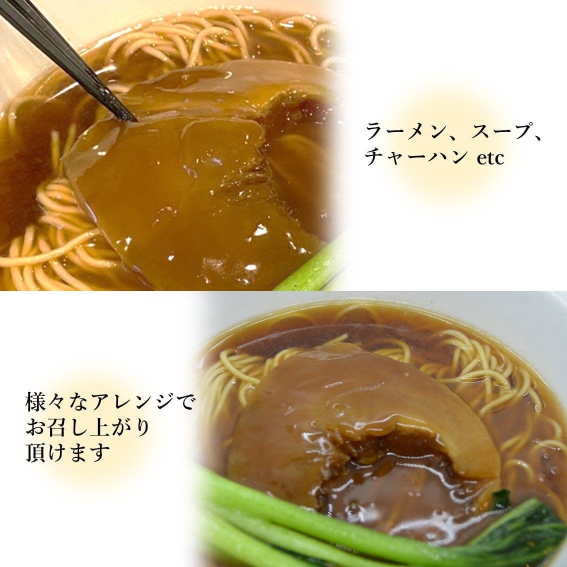これぞ高級中国料理!高級食材として名高いフカヒレがご自宅で解凍、湯せんで簡単に召し上がれます。手間暇かけて煮込み食材の旨味を最大限引出し、フカヒレの食感も残した絶品をお楽しみ下さい。丼物や、あんかけ炒飯、ラーメンなど色々アレンジもできます。