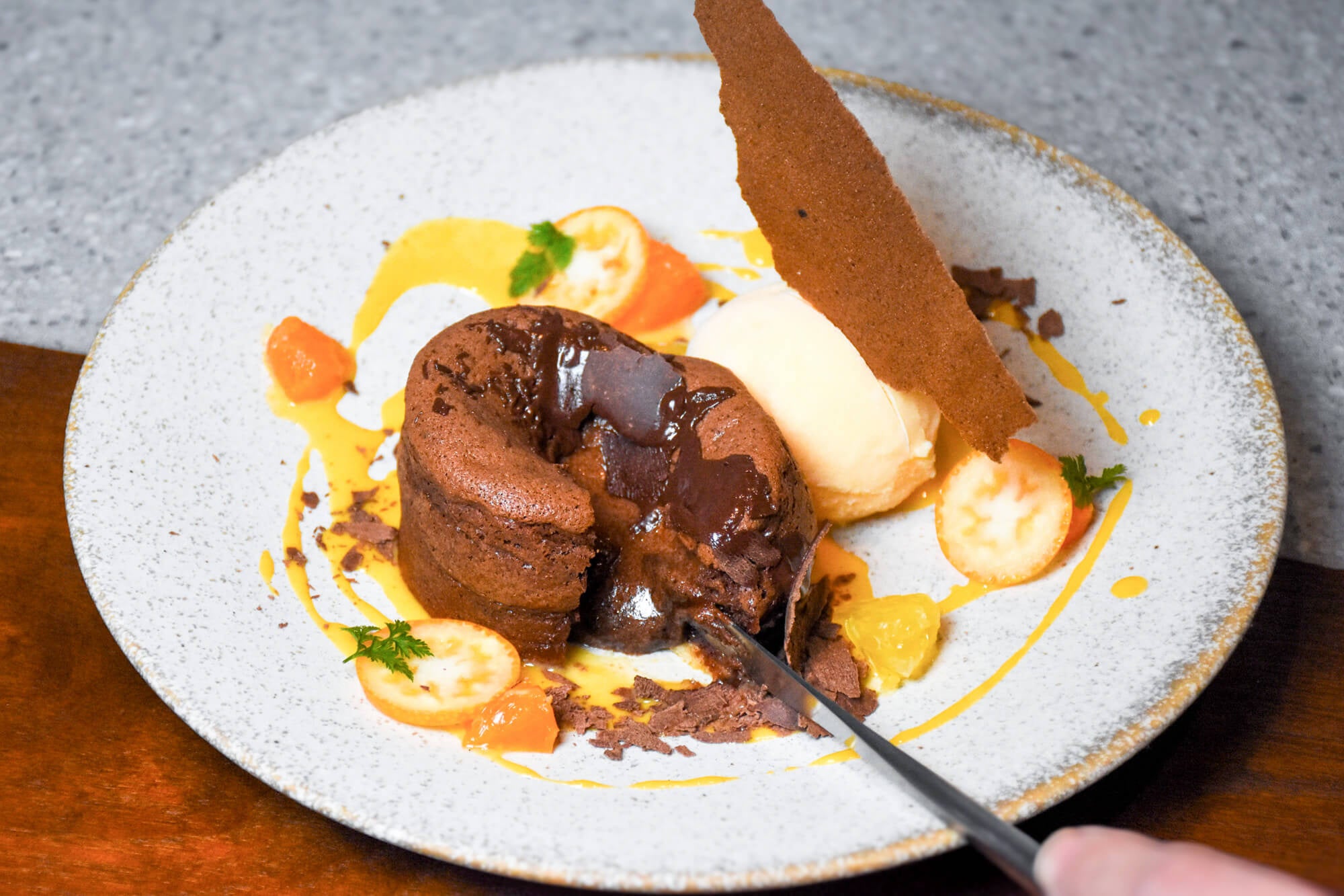 フォンダンショコラには、Minimal定番フレーバーの板チョコレート「NUTTY」風味のチョコレートを使いました。ナイフを入れると、とろりとチョコレートが溶け出し、ナッツのようなコクのある濃厚なチョコレートの香りが広がります。オレンジのアングレーズソースや3種の柑橘を合わせることで、濃厚なチョコレートと、ほろ苦く爽やかな柑橘の相性をお楽しみいただけます。