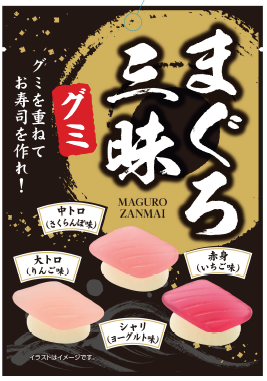 日本の代表食とも言えるお寿司が体験型のグミになって登場。グミでできたシャリとネタを自分で重ねて、赤身、中トロ、大トロのお寿司を再現して楽しむことができます。