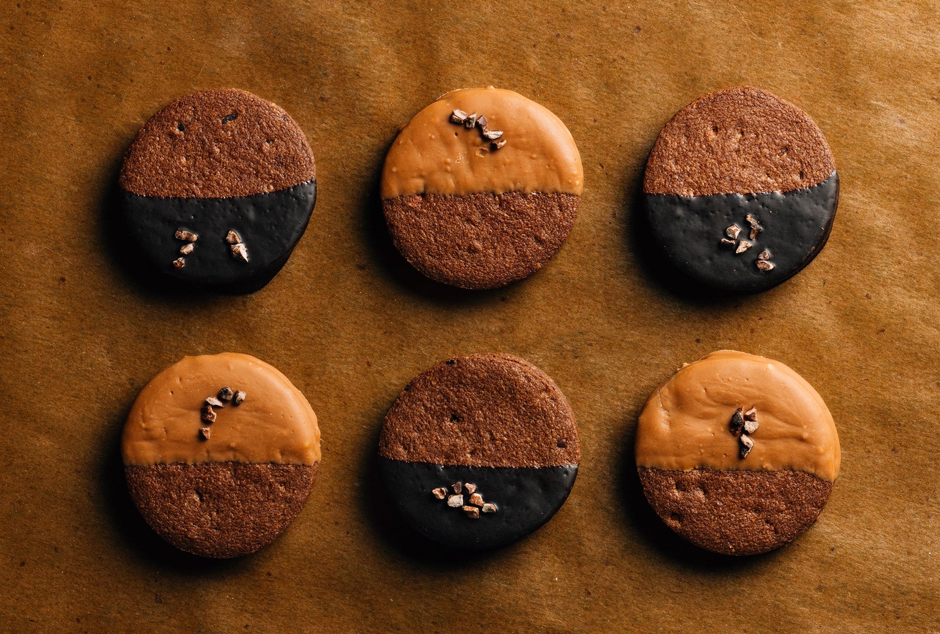 軽い食感のクッキーにビターとミルクのチョコレートを挟み、コーティング。各3枚、計6枚を1セットに。