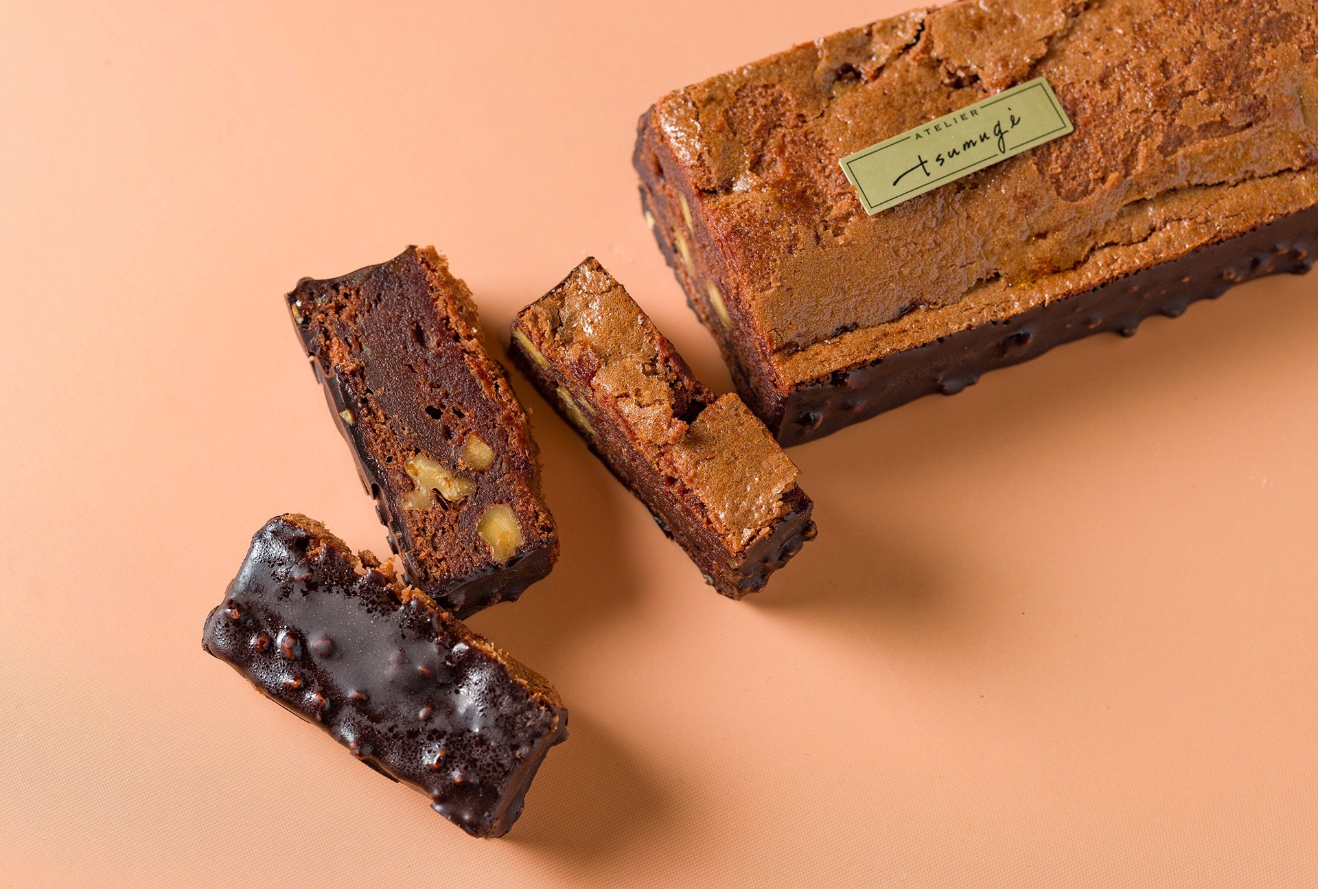 チョコレートとナッツの香りを閉じ込め、しっとりと焼き上げたブラウニー。アーモンドのチョコレートでコーティングしています。