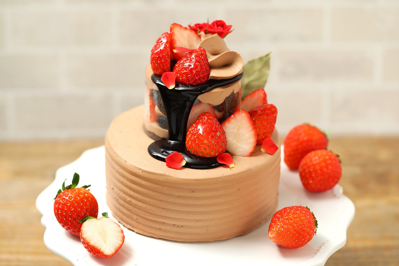 た。さらに、7cmのチョコケーキを重ね、苺、グラサージュ、ベルローズで華やかに飾り付けをして います。甘酸っぱい苺とチョコの組み合わせが大人な味わいの2段ケ ーキです。