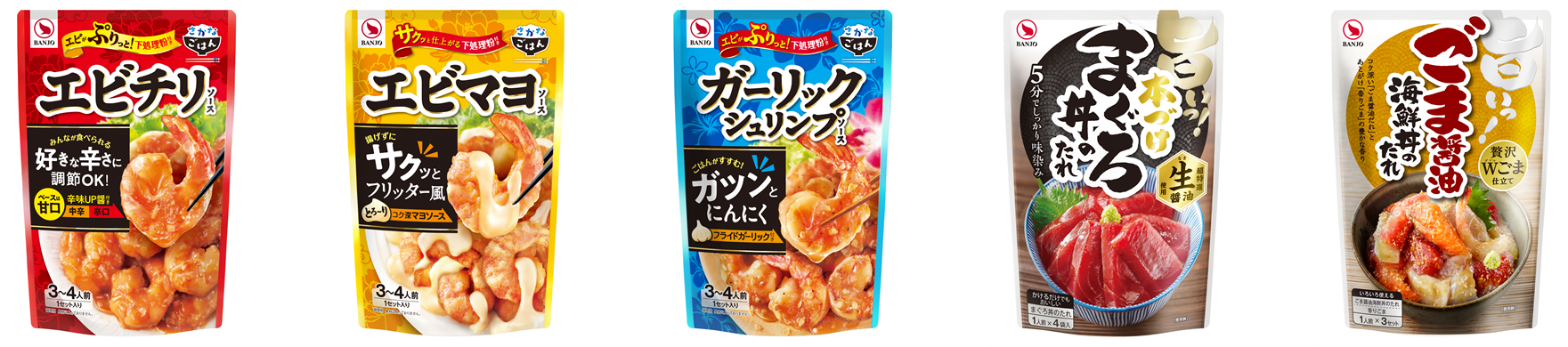 リニューアルした「エビチリソース」は家族全員でおいしく召し上がっていただける、甘口で仕立てたソースがベースですが、添付されている「辛みUP醤」でお好みの辛さに調節できる商品です。また、現行品ではレシピで推奨している卵がなくてもお楽しみいただけます。お子さまに人気の「エビマヨソース」は、ご好評いただいているフライパンでサクッとしたフリッター風になる食感やとろりとした濃厚な後がけマヨソースの特長はそのままに、ソースのレシピを改良しさらにおいしく楽しんでいただける商品です。さらに、パッケージデザインをゼロから見直し、店頭でも商品の魅力がダイレクトに伝わる新しいデザインフォーマットを、ご好評いただいている「ガーリックシュリンプソース」を含むエビ3種全品に展開したことにより、消費者が店頭の魚種と合わせてより手に取っていただきやすくなりました。