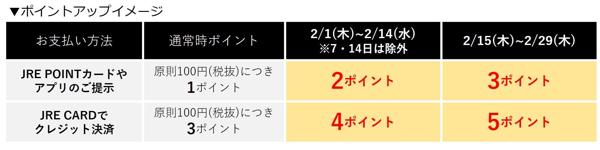 閉店前1時間に対象ショップで「JRE POINTカードやアプリのご提示」でお買い物をいただくと、通常原則100円(税抜)につき1ポイントのところ、2月1日~2月14日の期間は2ポイント 、2月15日~2月29日の期間は3ポイントをプレゼント。「JRE CARDでクレジット決済」の場合は、通常100円(税抜)につき3ポイント貯まるところ、 2月1日~2月14日の期間は4ポイント、2月15日~2月29日の期間は5ポイントをプレゼントいたします。