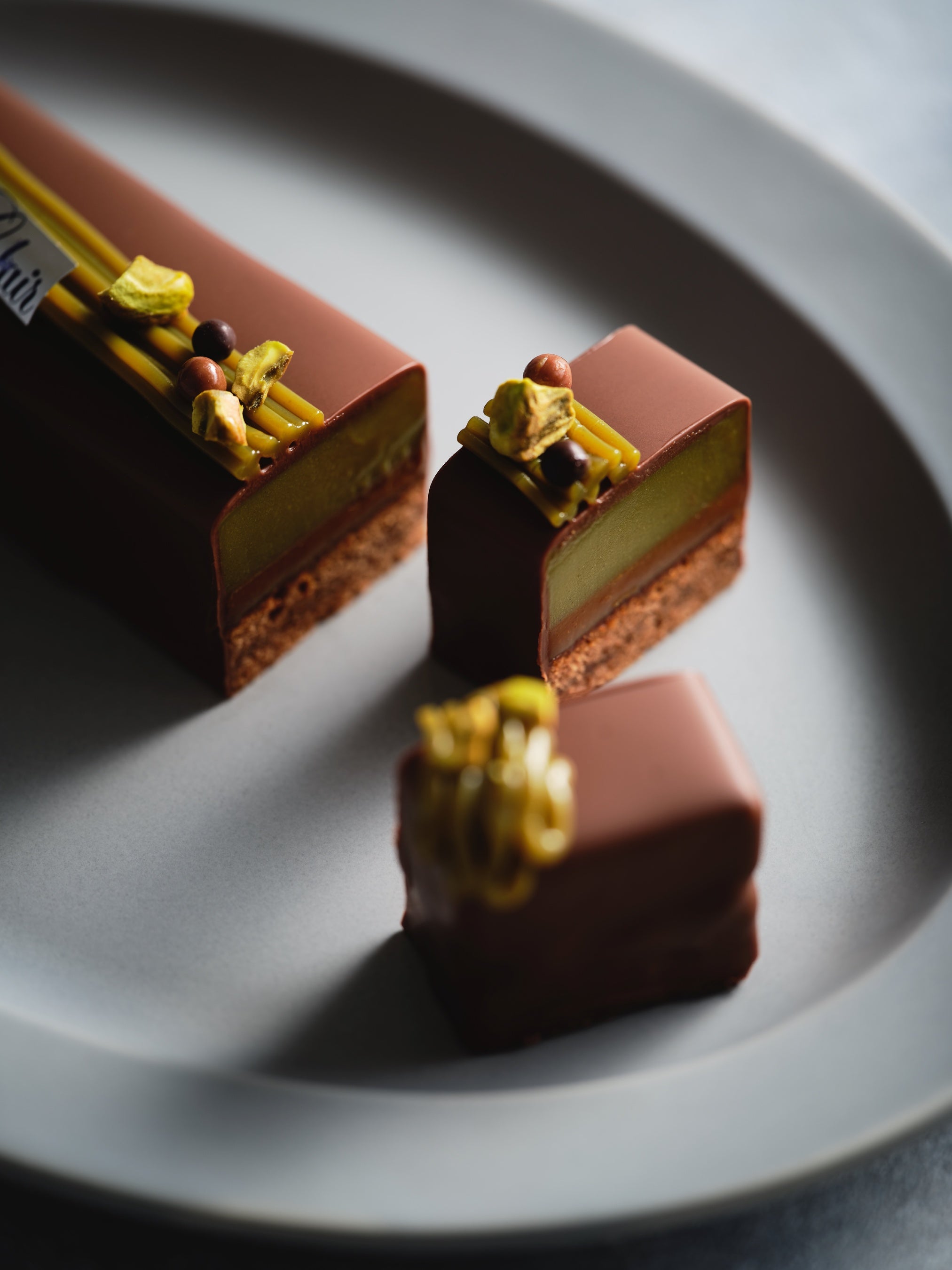 ショコラをしっかりと感じるブラウニーに、芳醇な香りのピスタチオのガナッシュを重ね、