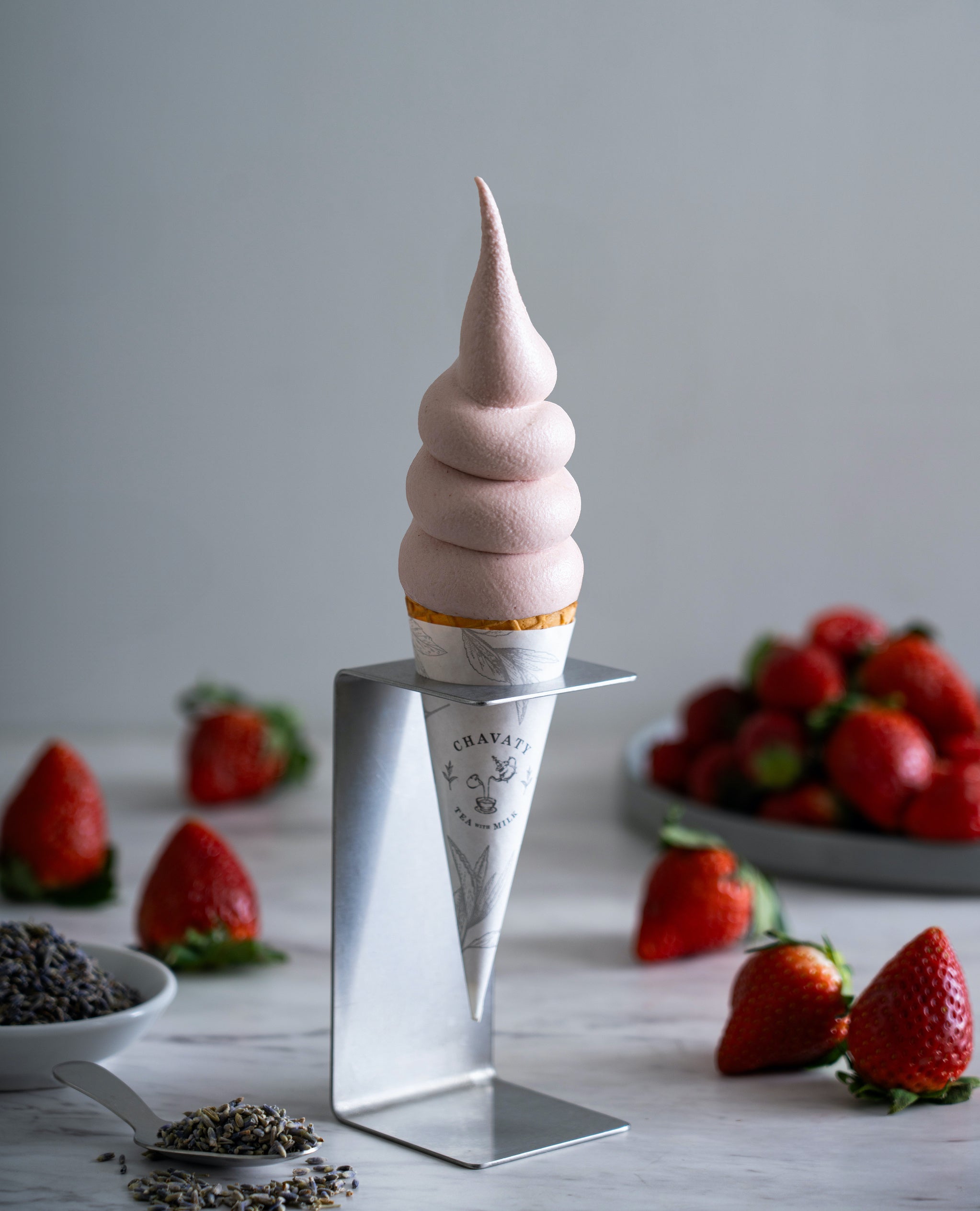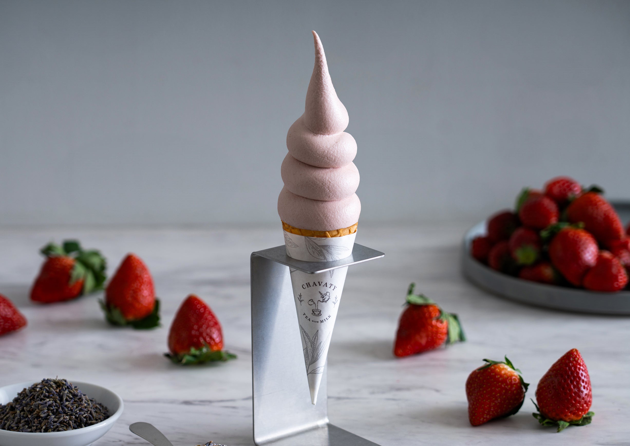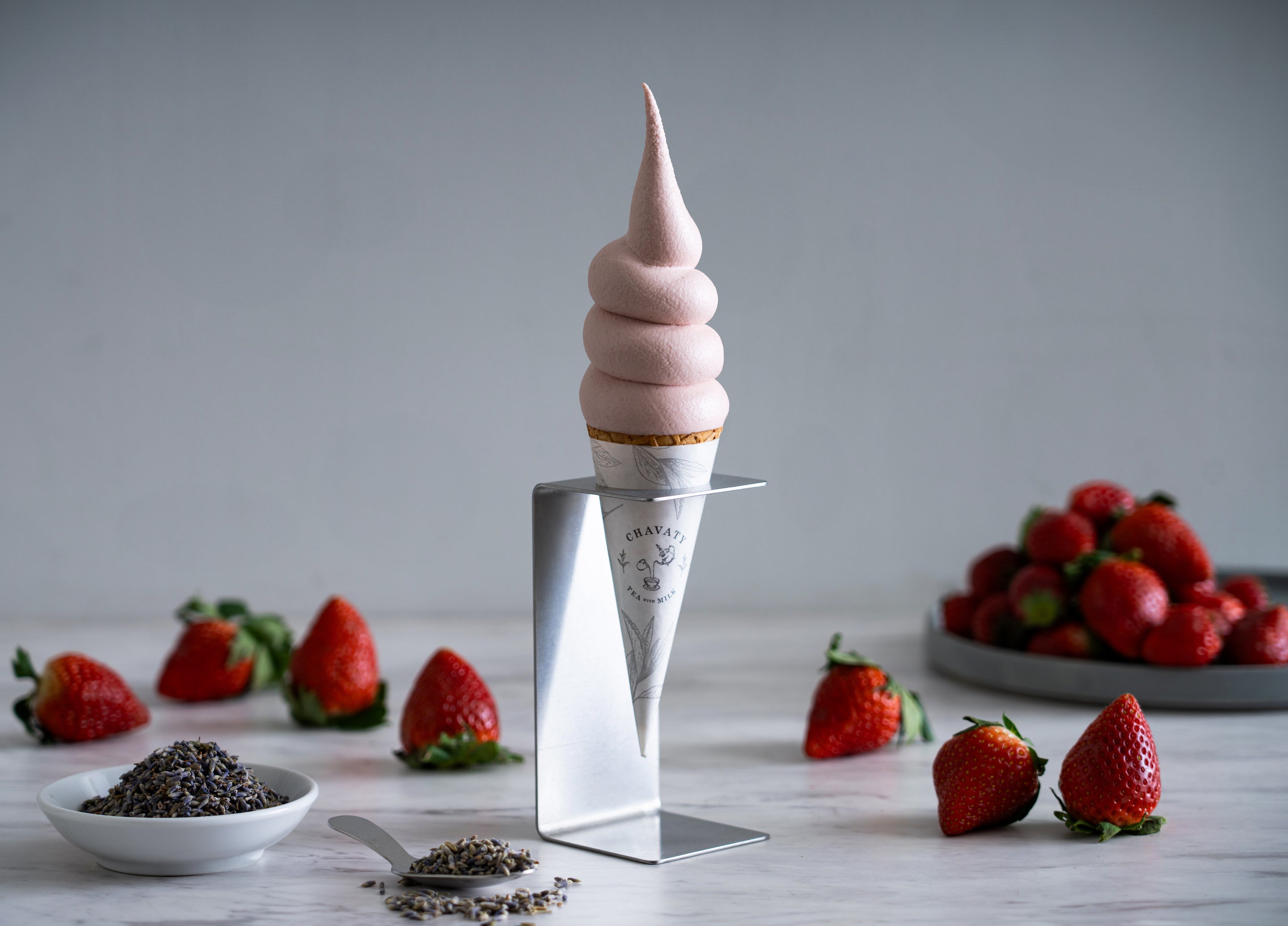 茶葉やハーブを丸ごと粉砕して使用し素材本来の香りや味わいを堪能する、CHAVATYオリジナルの季節限定ソフトクリームから、福岡県産のプレミアムいちご「あまおう」と、ハーブの女王と称される上品で清々しい香りが心地よいラベンダーを合わせた、この時期だけの華やかな味わいが登場します。