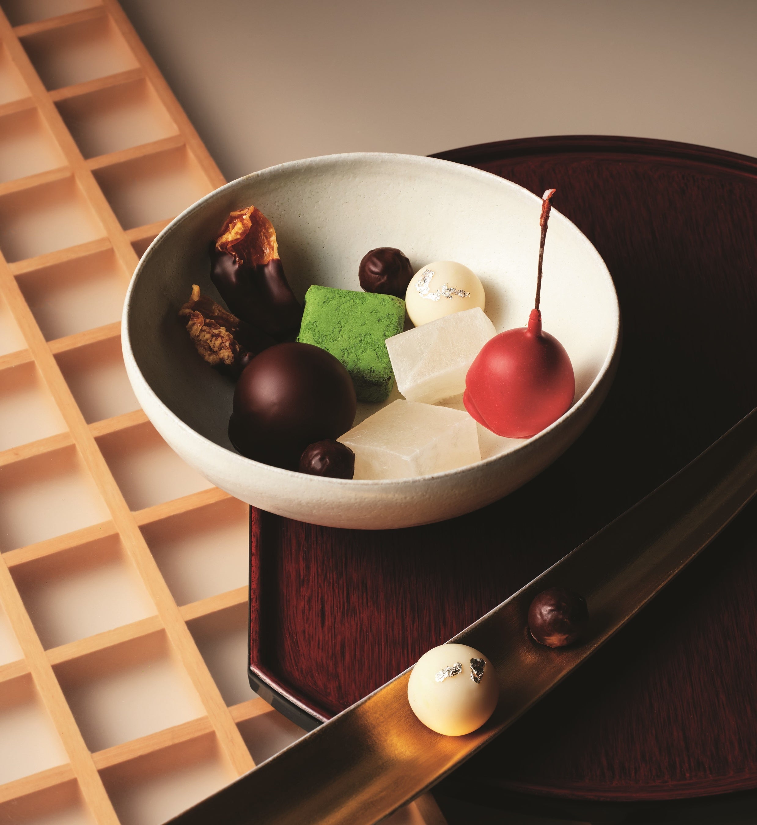 和のスウィーツ、あんみつの素材をショコラで表現。京都〈塩芳軒〉のあんこや宇治の抹茶、寒天カカオや黒豆ガナッシュ、シロップ漬けチェリーを自家