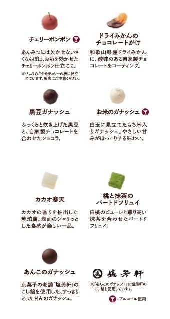 甘味処でいただく和菓子の宝石箱「あんみつ」を表現したショコラの詰め合わせ。 自家製チョコレートを使用し、寒天、黒豆、白玉やみかんを、ショコラティエ パレドオールならではの「和×ショコラ」で表現しました。