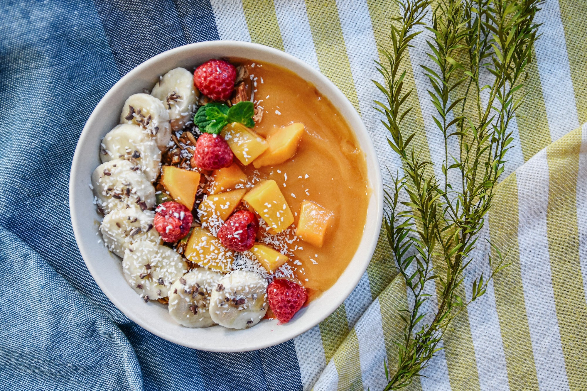 トロピカルマンゴーボウルは、ビタミン豊富なマンゴー&カロテン豊富なパッションフルーツをふんだんに使用。ベースに使用しているココナッツウォーターには、エネルギー代謝を促すマグネシウム、むくみ解消や新陳代謝促進を助けるカリウムなどのミネラルが豊富に含まれています。ざくろのフルーティーな甘味と風味づけにグレナデンシロップで仕上げました。