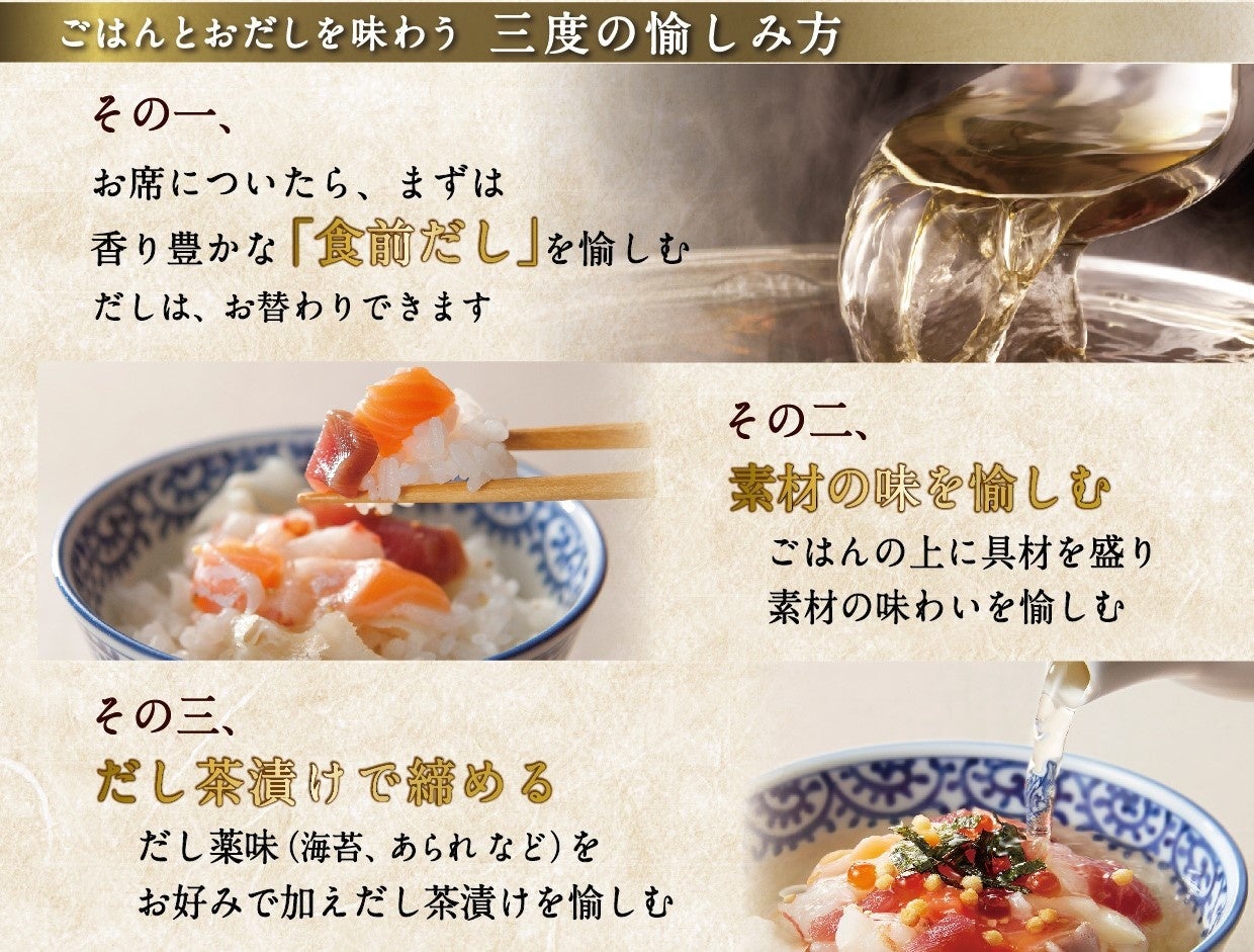 会津産コシヒカリを使用したおいしいごはんを堪能し、北海道産昆布と枕崎産鰹節の旨味が凝縮された特製だしを、食前だしや、最後の締めのだし茶漬けとして愉しむ、ごはんとおだしを味わうお店です。