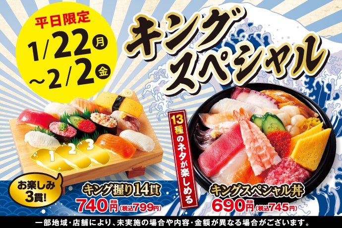 持ち帰り寿し店の「⼩僧寿し」「茶⽉」を運営する株式会社⼩僧寿しは、持ち帰り寿し店「⼩僧寿し」にて、1月22日(月)~26日(金)、1月29日(月)~2月2日(金)の期間限定で、「キングスペシャルフェア」を開催致します。