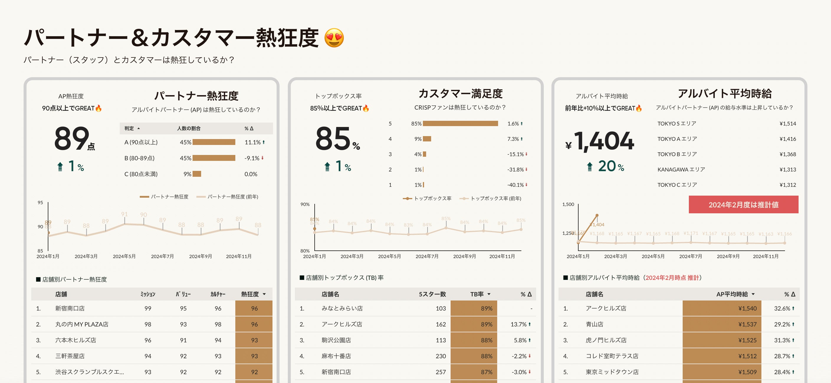また、パートナーの平均時給・熱狂度(エンゲージメント指数)やお客様の満足度、商品の良品率・提供時間をリアルタイムで公開し、私たちのミッションの推進を具体性と透明性をもって世の中に発信します。