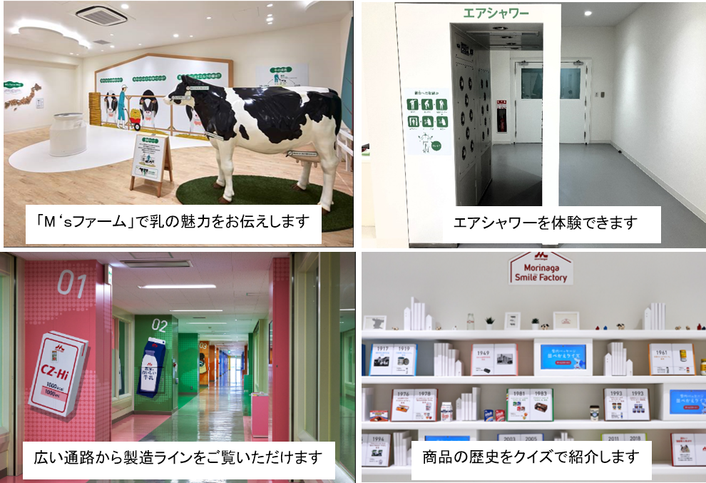 ② 体験(15 分) 酪農に関する展示エリア「M‘s(エムズ)ファーム」では、実物大の牛の模型を用意し、乳牛や酪農の お仕事について楽しく学ぶことができます。また、食品工場の衛生・品質管理に欠かせないエアシャワ ー(身体についたゴミやほこりを取り除くための装置)の体験ができます。