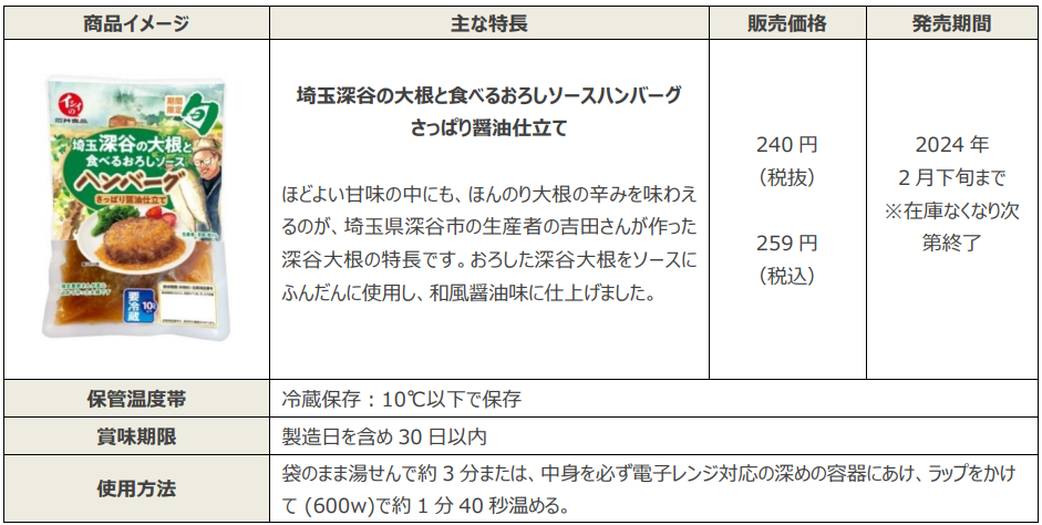 『埼玉深谷の大根と食べるおろしソースハンバーグ さっぱり醤油仕立て』は、まろやかな甘みのなかにほんのり大根の辛みを味わえる深谷大根の特長を活かすために大根おろしをソースに使用し、醤油味に仕上げました。ソースまで余すことなく味わっていただけるハンバーグです。深谷大根の生産者である吉田旭さんからは「作り手の顔が見える商品のため、多くの人に自分が丹精込めて育てた深谷大根を知り、食べてもらえることにやりがいを感じている」とのお声をいただいております。また、商品パッケージにはハンバーグの盛り付け画像を載せることで食べたくなるような商品をイメージして仕上げております。