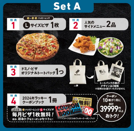 この福袋は、2023年12月29日(金)から販売する予定でしたが、販売延期となっていた商品です。節分の時期に合わせて、「ドミノの福袋」改め、「ドミノの”福は内”袋」にバージョンアップしました。特典として、①「1-2ハッピーレンジのLサイズピザ1枚、②人気のサイドメニュー2品、③ドミノ・ピザ オリジナルトートバッグ、さらに、④合計39,999円以上おトクとなるクーポン10種を1冊にまとめた「2024年ラッキークーポンブック」の計4つを詰め込んだSet Aの他に、トートバッグの代わりに、サイドメニュー3品が選べるSet Bも新たに追加。当初の販売予定数としていた3万個から、6万個に倍増してご用意しました。販売方法も公平性を期して、当初の先着順から抽選予約販売へと変更しました。「2024年ラッキークーポンブック」の有効期限も2025年1月末まで延長しました。