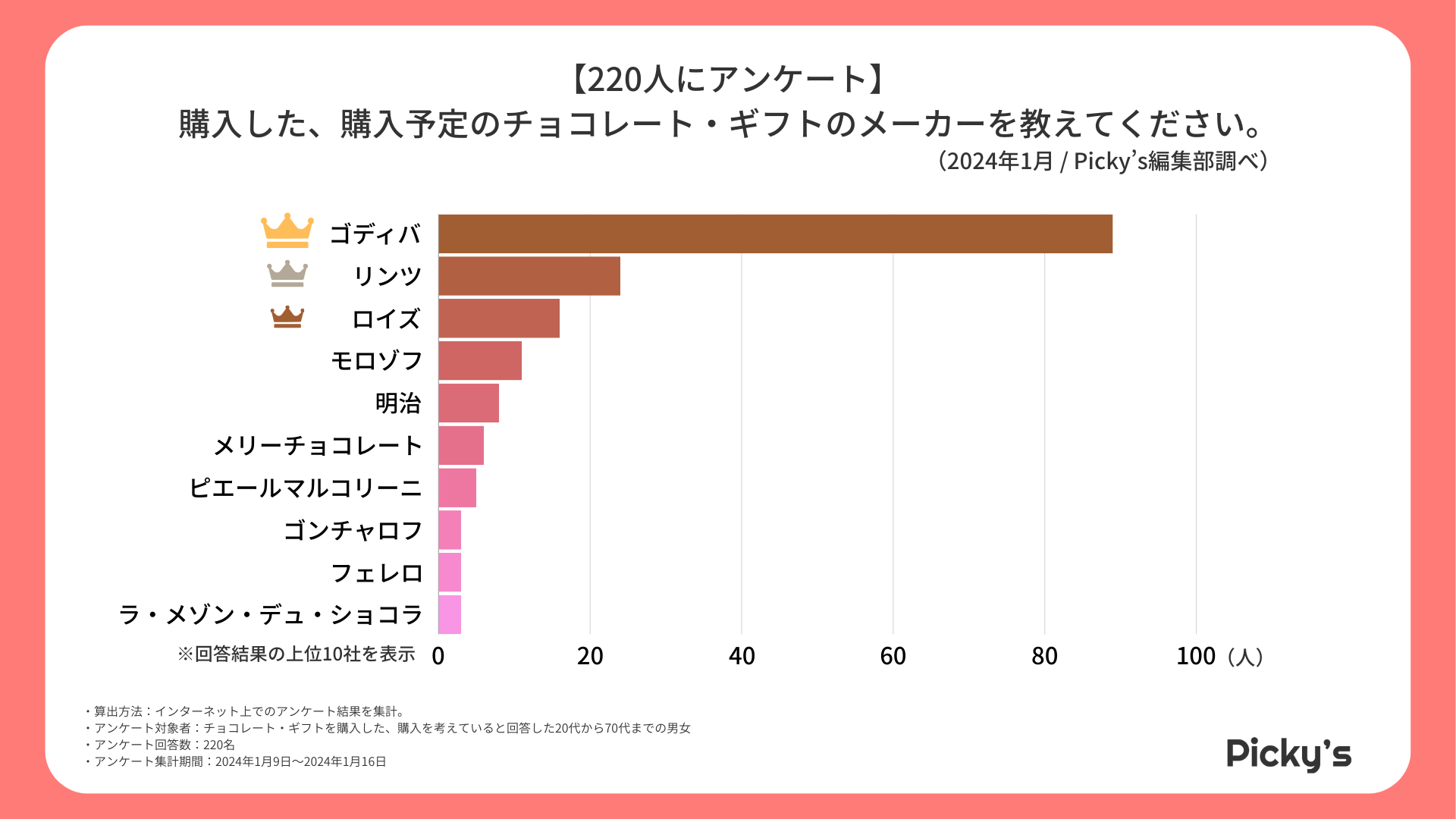 「ゴディバ」が最も多い結果となりました。続いて「リンツ」、「ロイズ」が選ばれています。