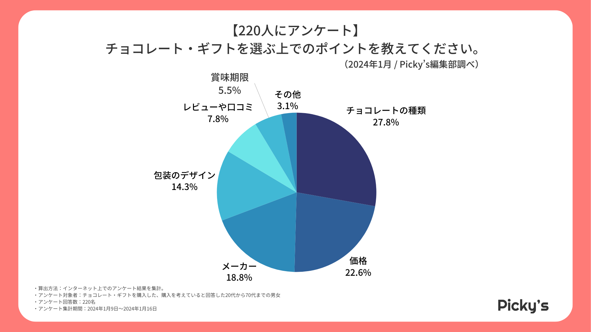 「Picky’s」は、インターネットショッピングにおいて、購入前に試せない・選ぶべきものがわからないという課題の解決を目標に、あらゆる商品のおすすめランキングや検証レビューを紹介するサイトです。このたびPicky’s(https://rentry.jp/)では、チョコレート・ギフトについてインターネット上でアンケート調査を行いましたので発表いたします。
