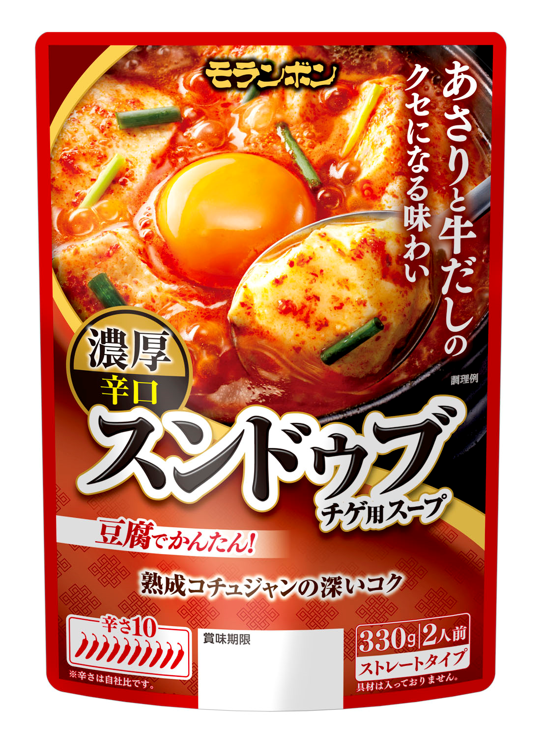 パッケージデザインには、『モランボン スンドゥブチゲ風スープ 濃厚辛口』と同じ調理写真をデザインし、イメージカラーには味わいの濃厚さと辛さを想起させる深みのある赤色を配色いたしました。