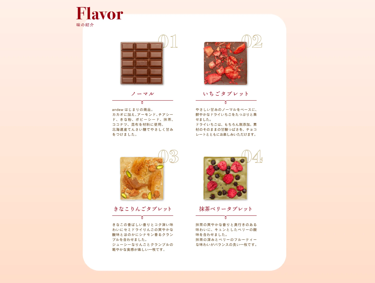 どれもバレンタインに合わせたandewの自信作。本命チョコ、友チョコ、親チョコ…「世界一やさしいチョコレート」を、世界一やさしいあの人へ。プレゼントしてみてはいかがでしょうか。