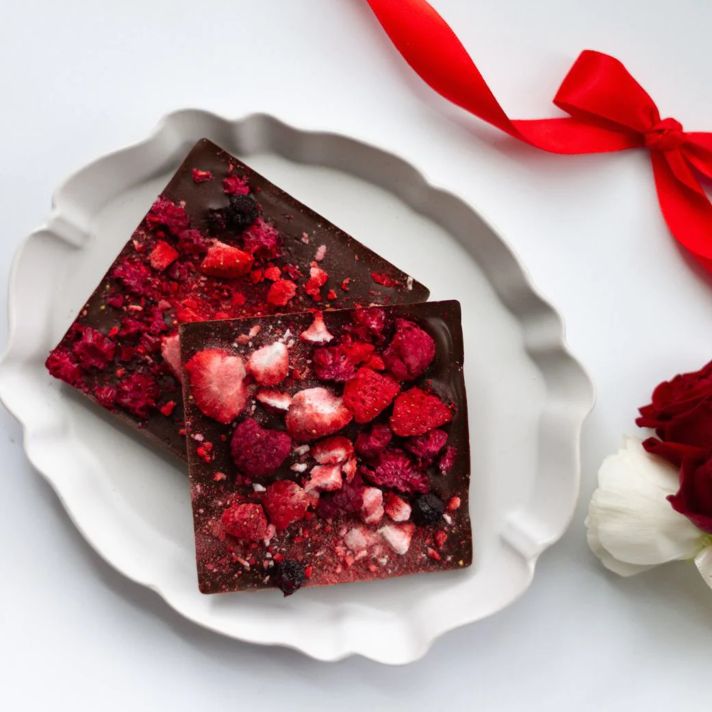 昨年のバレンタインにて登場したミックスベリータブレットが再登場。無添加のいちご・ブルーベリー・フランボワーズをふんだんにトッピングしたミックスベリーフレーバー。ベリーの酸味をチョコレートのマイルドな甘みが包み込みます。ベリーが輝く華やかな見た目は、プレゼントにもぴったり。このボリュームのあるチョコレートタブレットを2枚、スモーキーピンクのギフトボックスに入れてお送りします。