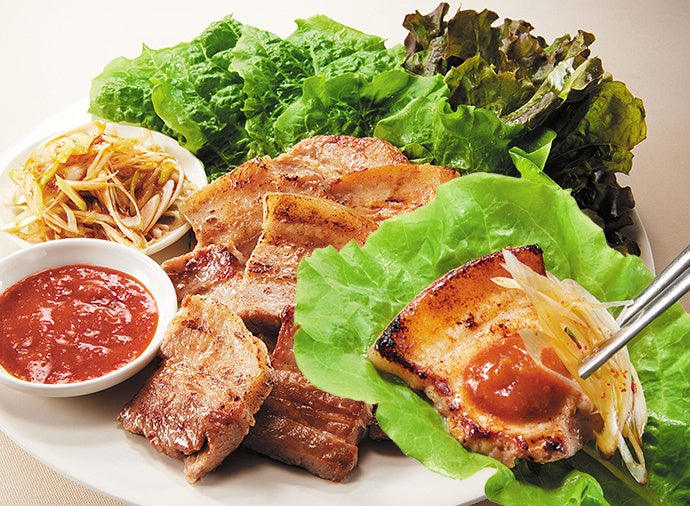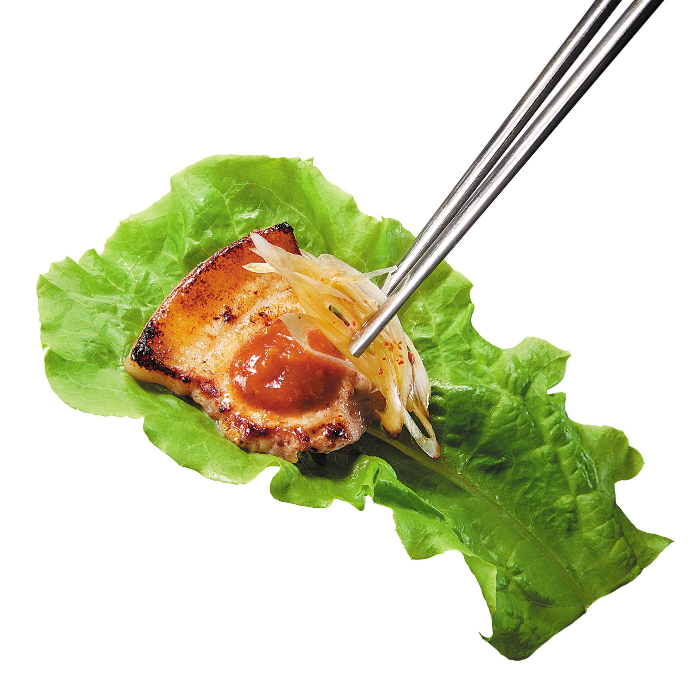 旨塩漬け込みだれで約10分漬け込んだ肉を焼き、お好みで辛味ねぎやサムジャンと一緒に野菜で包んで召しあがれます。