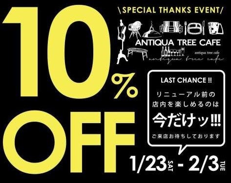 リニューアルを控えた1/23(火)~2/3(土)までの期間、日頃のご愛願に感謝を込めて店内全品10%OFFのスペシャルサンクスイベントを開催!