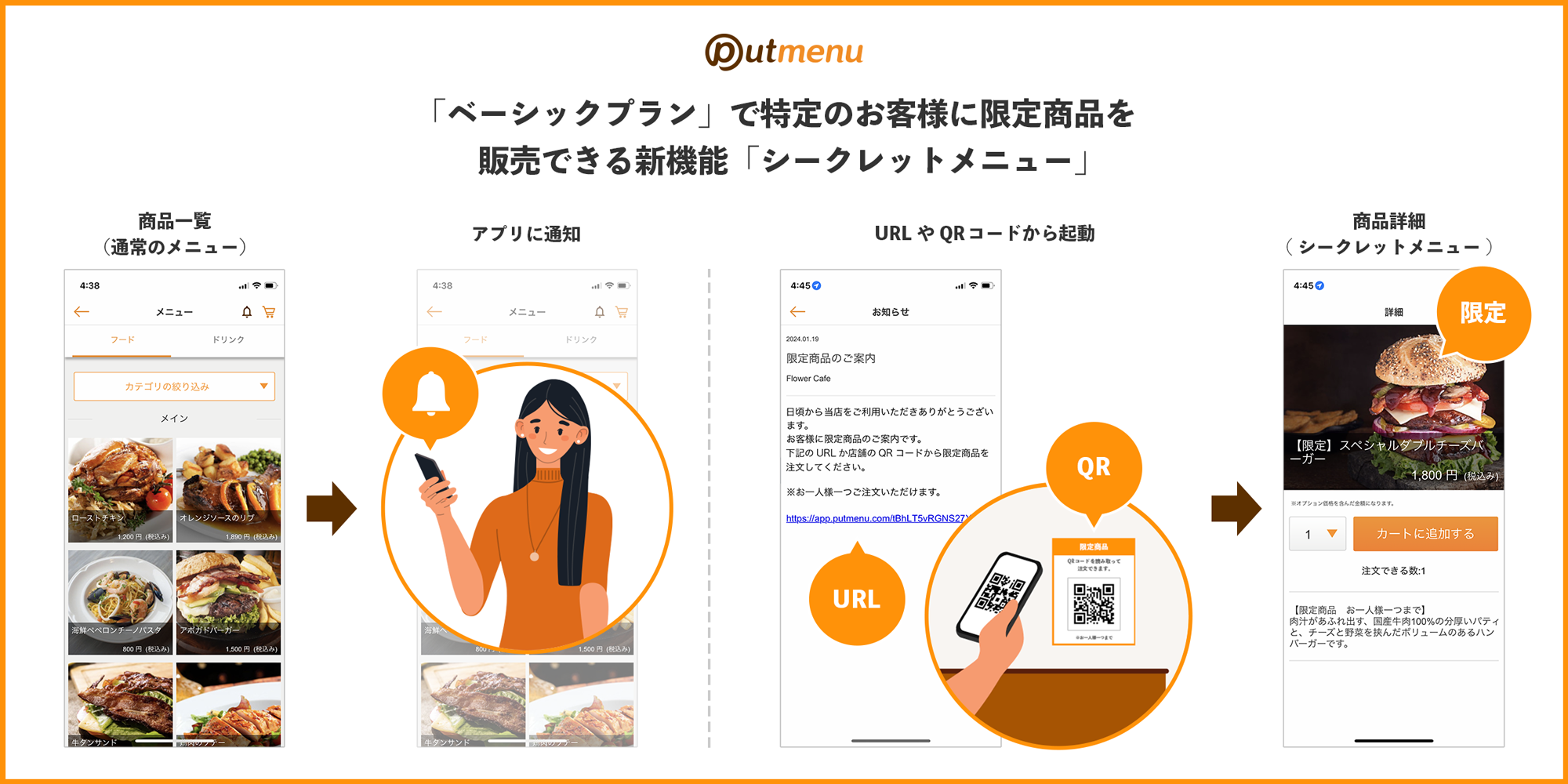 この度、「ベーシックプラン」で特定のお客様に限定商品を販売できる新機能「シークレットメニュー」の機能をリリースしました。「シークレットメニュー」の利用は簡単です。限定商品のURLを管理サイトで発行して、そのURLを特定のお客様にお渡しいただくことで、そのURLを知っているお客様だけが限定商品を購入できます。同時に注文数を制限する機能もリリースしました。
