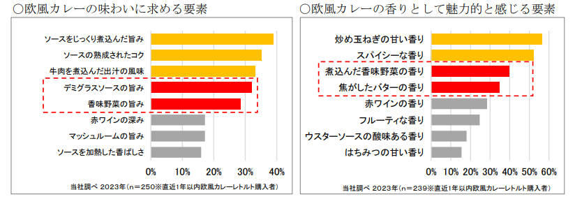 ホテルのカレーを代表するようなルウをベースにした、とろみが強く重厚感のあるものが一般的な欧風カレーにおいて、フレンチのスープストックをベースにスパイスに特徴を持たせた、滑らかでコクのあるソースの新しい欧風カレーが注目を集めています。また、欧風カレーの定番の味わいや香りに加えて、香味野菜や焦がしバターといった新たな要素が求められています。