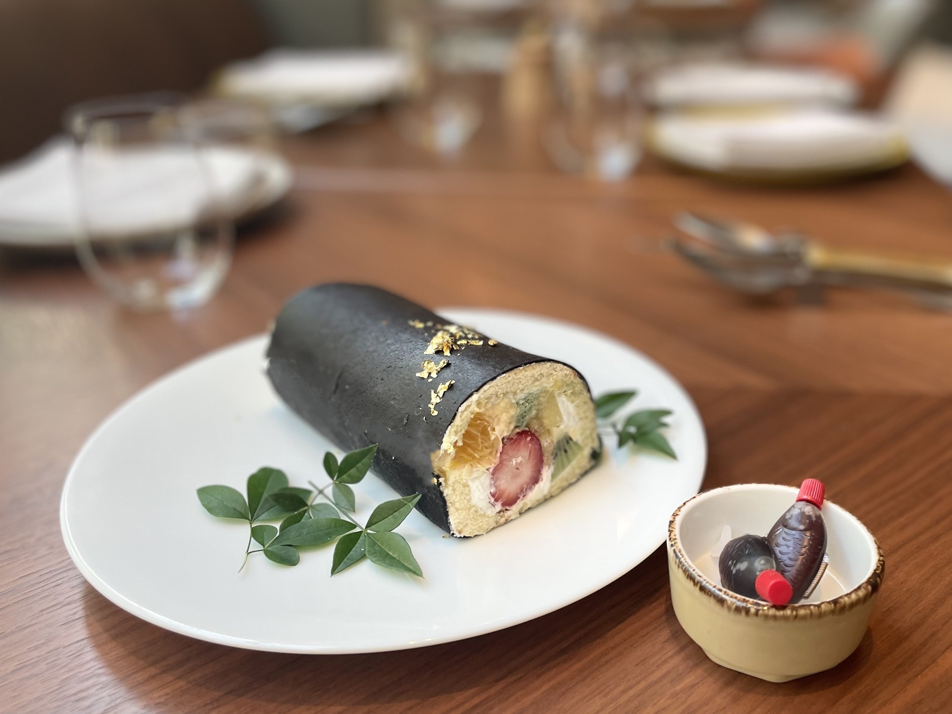 恵方巻ロールケーキは、見た目を恵方巻そっくりに仕上げ、醤油に見立てた別添えの黒蜜で味の変化もお楽しみいただけます。海苔に模したブラックココアパウダー入りのクレープと「大阪ハニー」を加えたしっとりとした食感のロール生地で、オレンジ、イチゴ、パイン、キウイ、カスタード、ヨモギムース、柚子ジュレの具材と生クリームを巻き上げます。「大阪ハニー」を使うことで、梅田ミツバチプロジェクト(※)の活動にも貢献しています。