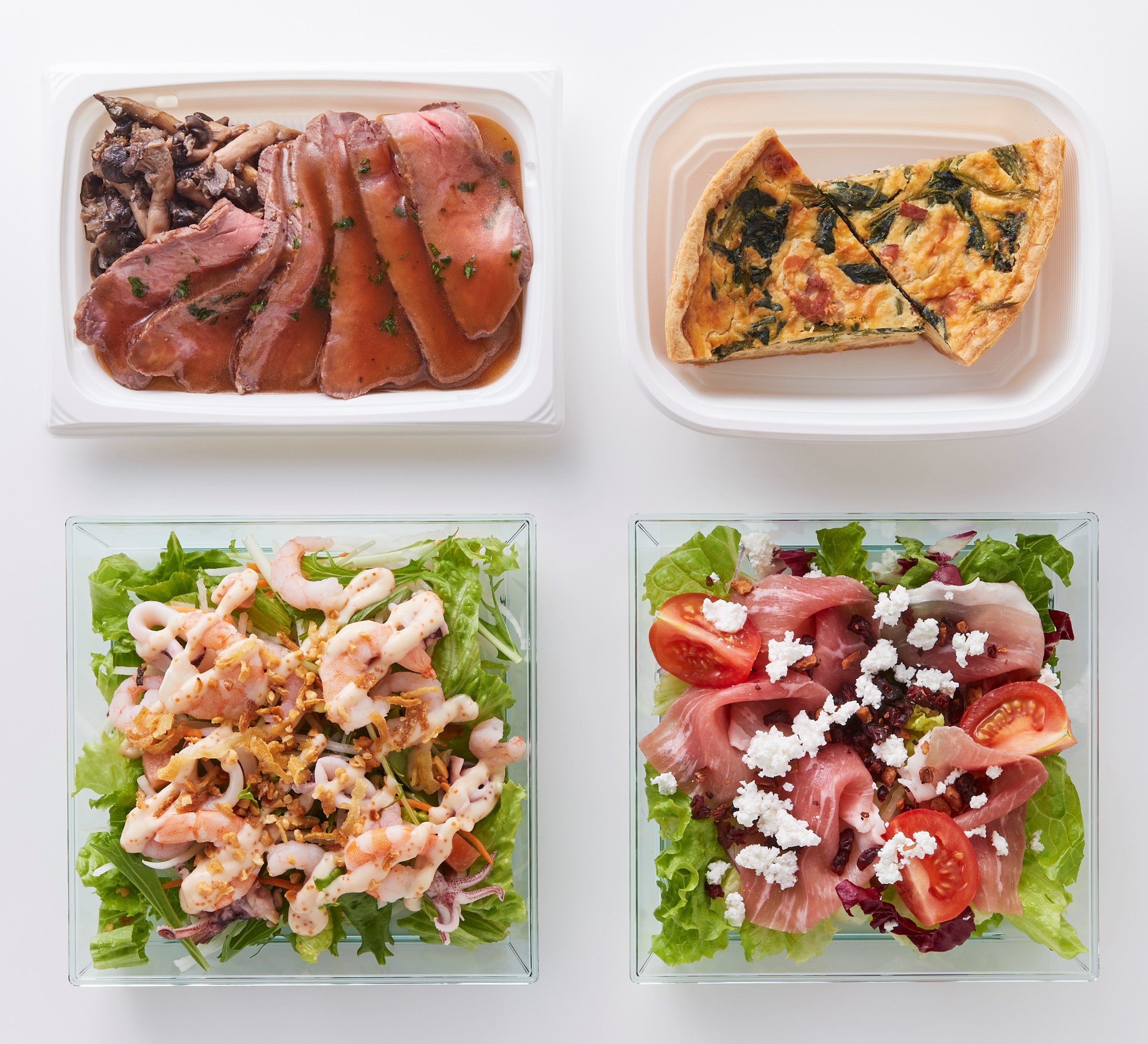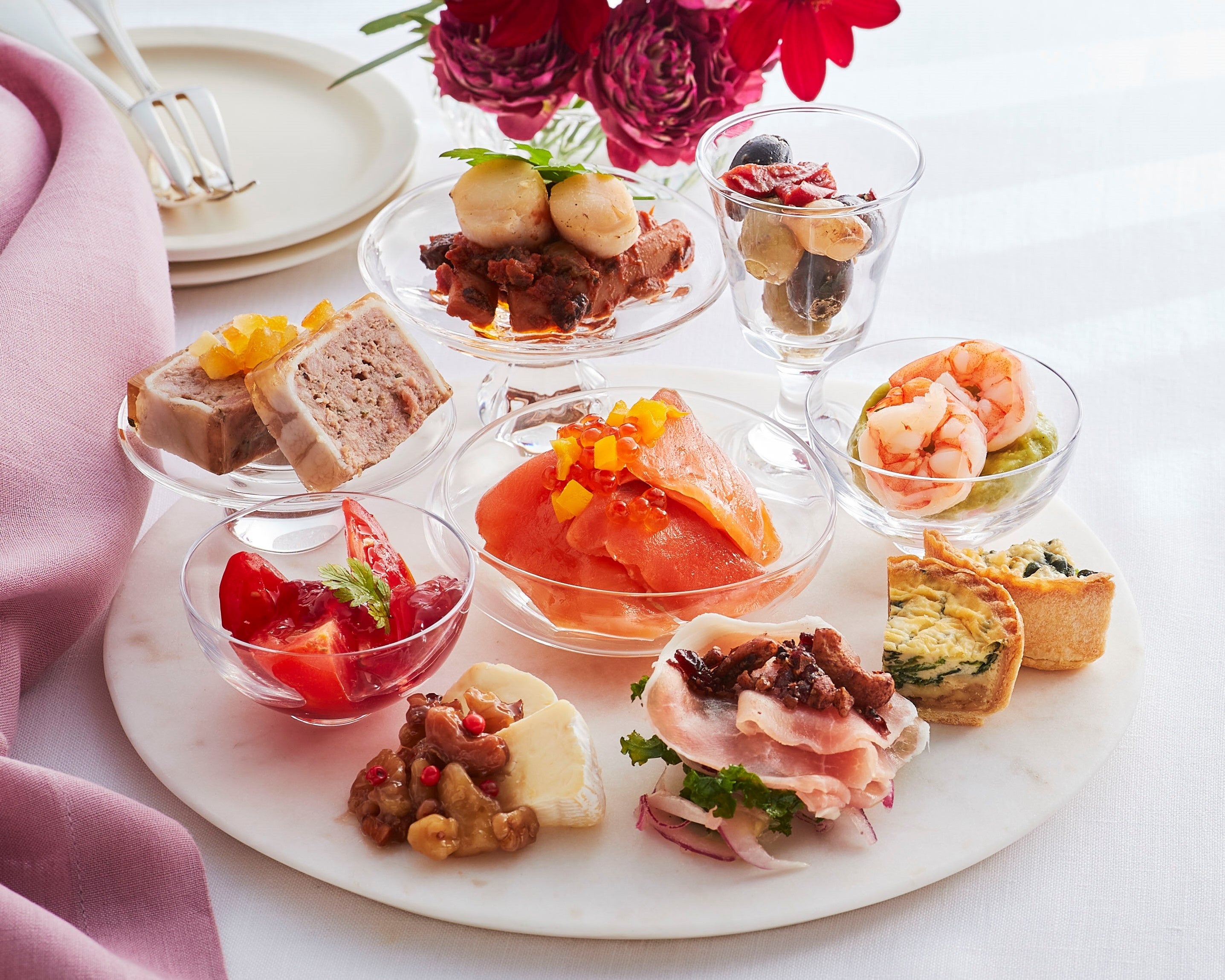 食卓を華やかに彩る、サラダ、キッシュ、料理の組み合わせ。日ごろのご褒美を兼ねたバレンタインのイベントメニューとして、手軽にお楽しみいただけます。
