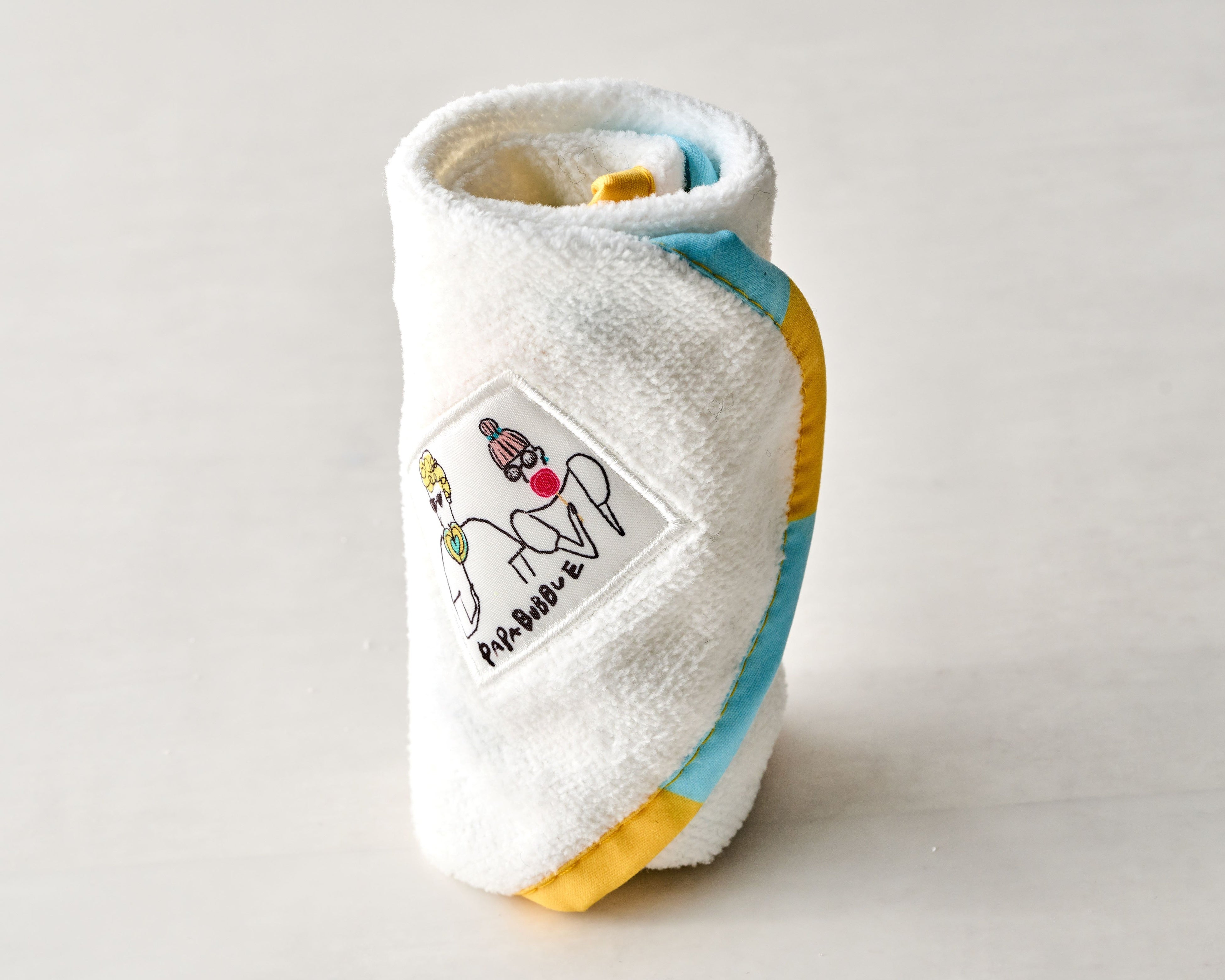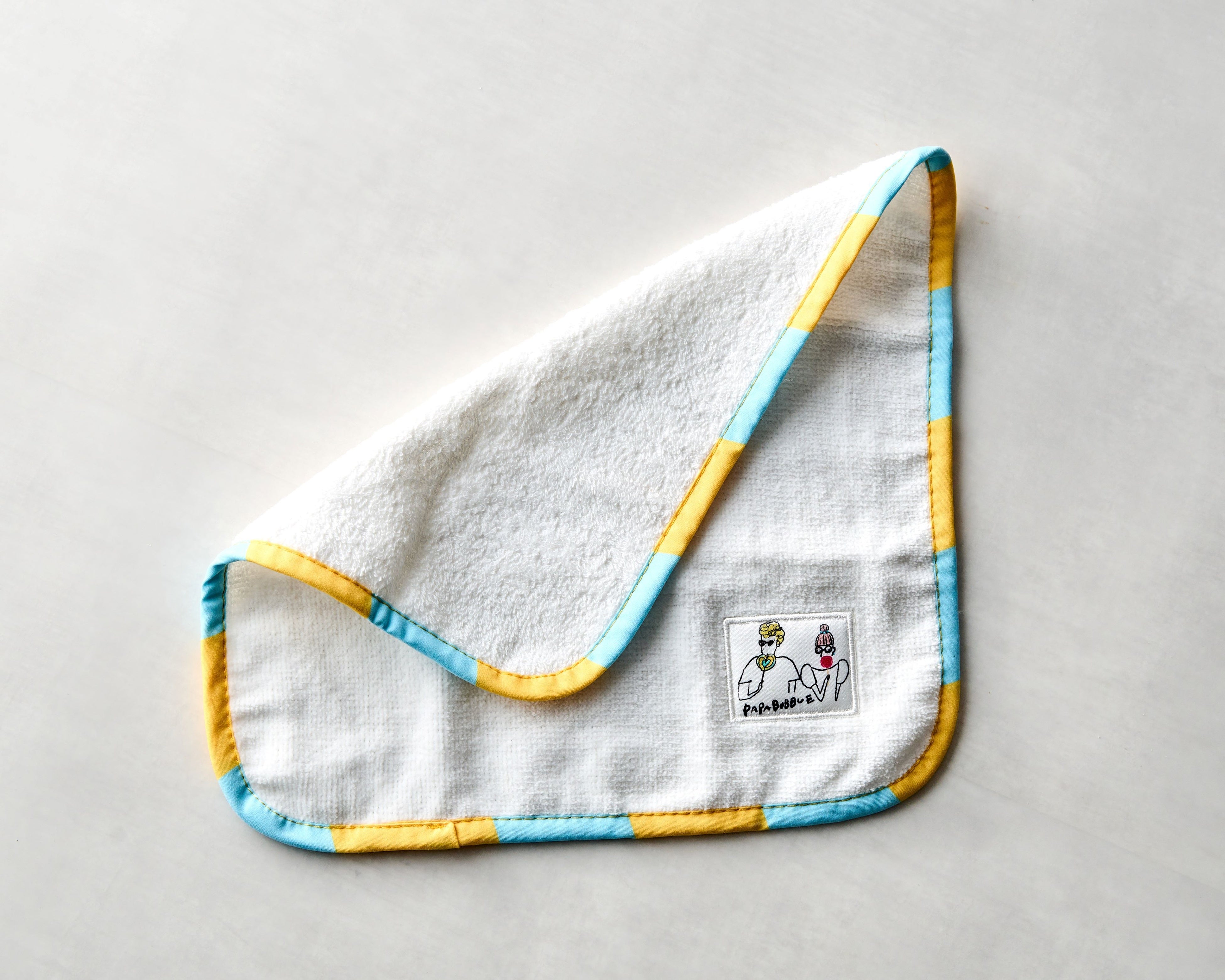 タオルは糸を紡いで作ることから「人の縁を繋ぐ」という意味があります。プレゼントにも人気が高く、喜ばれるタオルは、日常使いしやすいサイズ感をご用意しました。タグ部分にはパパブブレのロリポップキャンディを食べている可愛らしいイラストが描かれています。水色と黄色のバイアス部分はロリポップキャンディをイメージしたストライプでオシャレに仕上げました。キャンディと一緒に、形に残るプレゼントをしたいという方におすすめの、ちょっとした感謝の気持ちを伝えるのに最適なギフトです。