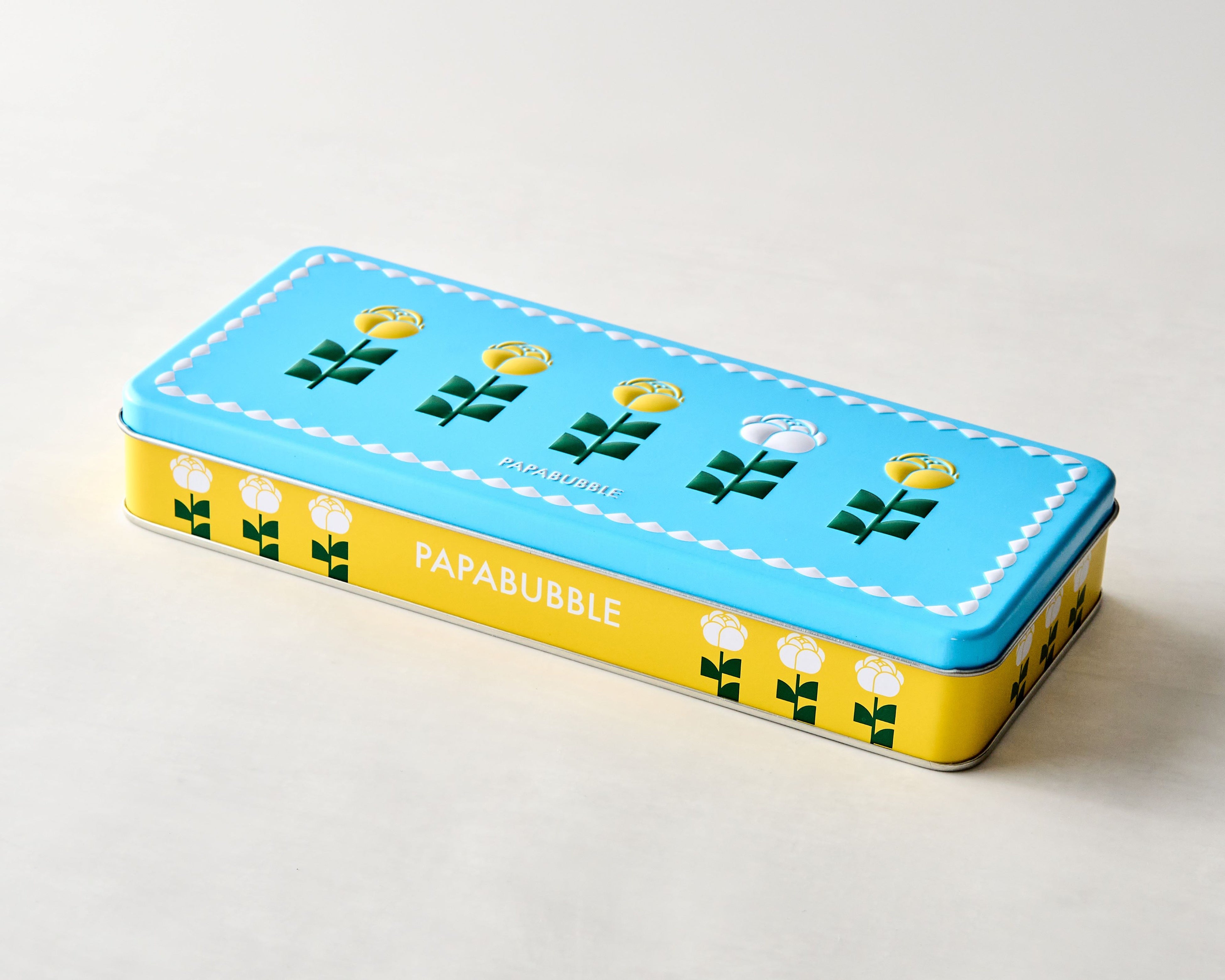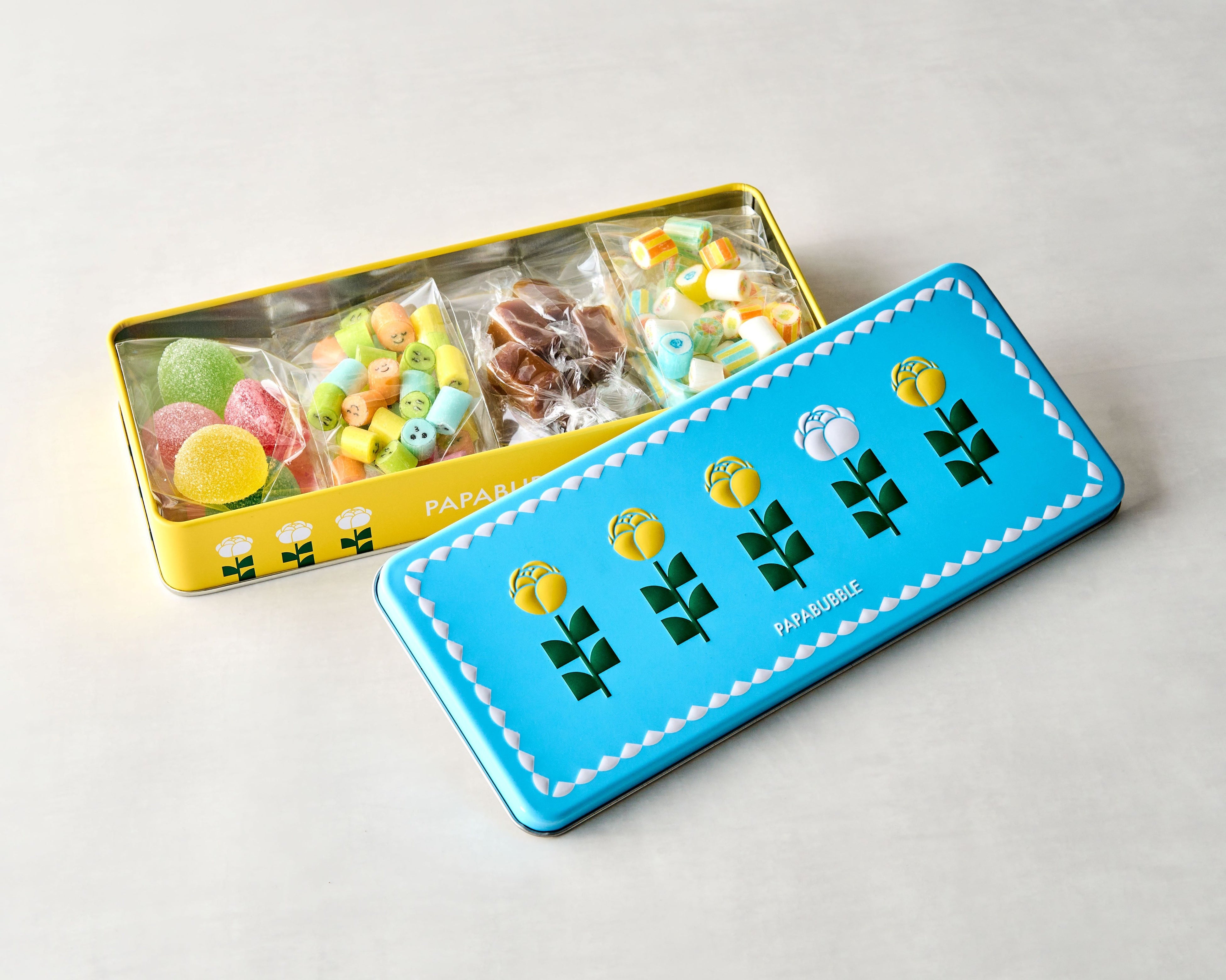 パパブブレ初、人気のオリジナル缶を使用したギフトです。ラナンキュラスをモチーフとしたイラストが描かれており、凹凸のあるデザインは自分用にも欲しくなるアイテム。大きめの缶でインパクトもあり、喜ばれること間違いなしの商品です。中身は「ホワイトデーミックス」「かおミックス」「バブレッツ」「キャラメル」の4種類で、限定のキャンディにもっちり食感のグミ、秘かに人気の高いキャラメルと、この缶1つでパパブブレのいろんな商品が楽しめます。
