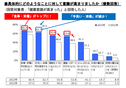 キリングループが2023年に実施した調査※2では、社会全体の生活環境変化に伴い、「体の内側から健康になりたい」「自分の健康は自分で守りたい」という意識が高まっていることが分かりました。また別の調査※3で”どのような行動に対する意識が高まったか“を尋ねたところ、下図の通り2022年は「手洗い・消毒など」が1位でしたが、2023年は「食事・栄養」が1位となり、「睡眠」「運動」のスコアは2022年より大幅に増加しました。また「健康増進」のためにお金をかけているものは「サプリメント」「ウォーキング・ランニングのためのシューズ・ウェア」「自宅で使う筋トレグッズ」など、“手軽”に“ひとり”でできるものが上位となりました※3。お客様の健康意識は引き続き高く、行動様式は健康増進に向けたポジティブな内容に変化したことがうかがえます。