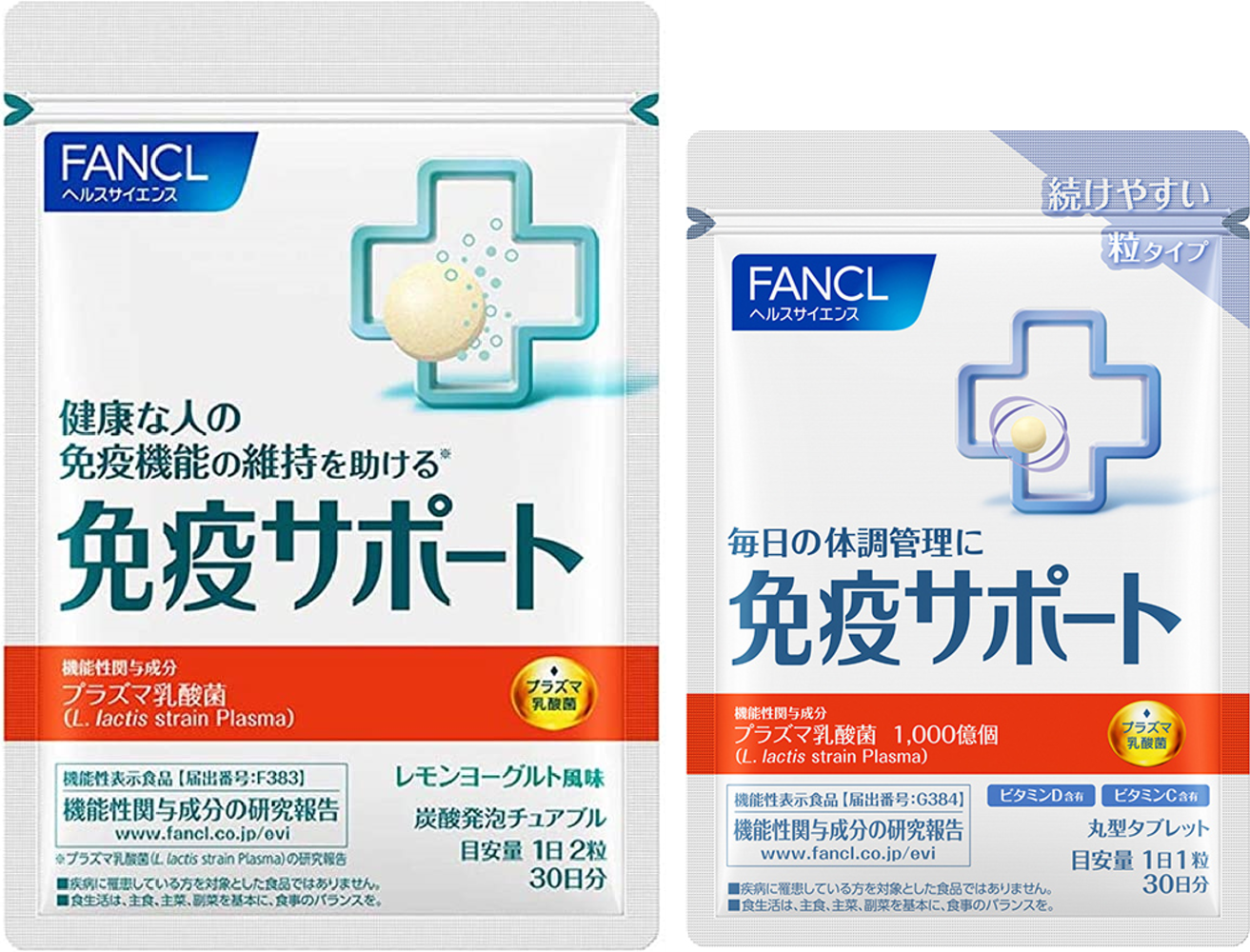 ・株式会社ファンケル(社長 島田和幸)が販売する「免疫サポート」は、免疫の司令塔に働きかける「プラズマ乳酸菌」を配合した「免疫特化型」サプリメントです。また、ビタミンCやビタミンDも1日摂取目安量を配合しており、高い評価をいただいています。粒タイプとチュアブルタイプの2商品を販売しており、家族のお好みや、使用シーンに合わせて選んでいただけます。