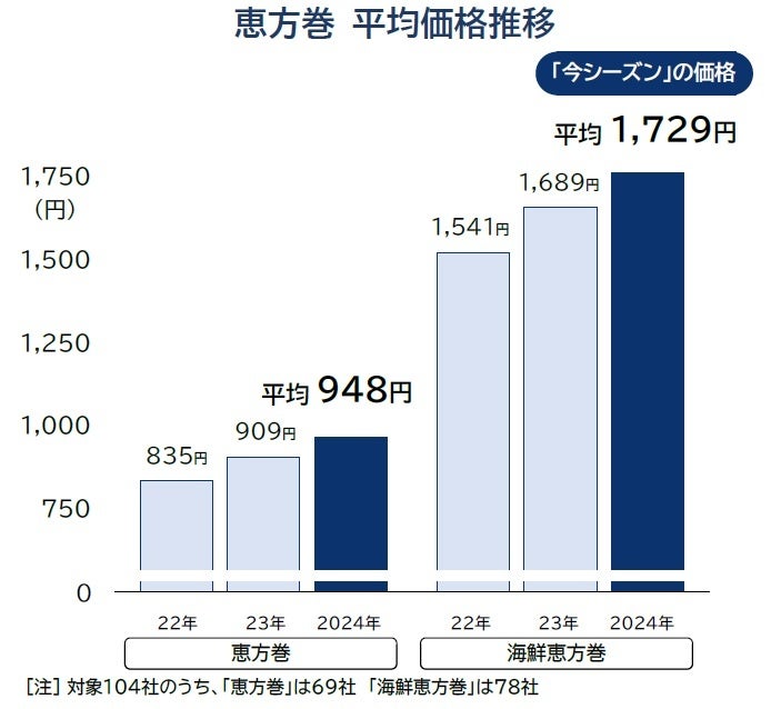 全国の大手コンビニエンスストアや外食チェーン、スーパー、百貨店、著名な日本料理店など計104社で販売される2024年節分シーズンの恵方巻価格を調査した結果、一般的な五目・七目の恵方巻(太巻・1本当たり)における平均価格は948円(税込)だった。1年前(23年節分、「昨シーズン」)の909円に比べて39円、率にして4.3%の値上がりとなったほか、2年前に比べると113円・13.5%の値上がりとなった。豪華で高級志向な品が多い海鮮恵方巻では平均1729円となり、前年(1689円)から40円・2.4%の上昇となった。