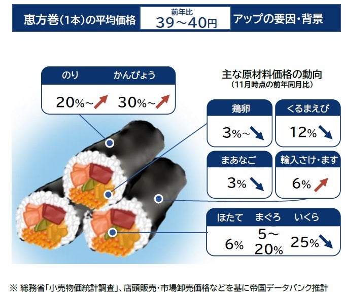 昨シーズンに価格が高騰した食材のうち、使用頻度の高い味付かんぴょうが中国産で不作となり前年から30%以上の価格高騰が見込まれるほか、海苔も記録的な不作となるなど、大幅なコスト増が避けられないものもみられた。ただ、太巻きに用いられる玉子焼きでは鶏卵価格が一転して下落しているほか、昨シーズンに3割以上の値上がりとなった穴子も価格が落ち着いた。水産品では、他にもまぐろやいくら、ほたて、くるまえび、いくらなどで最大で20%超の安値と、価格が高騰した昨シーズンに比べ大幅に下落した品目も多く、海鮮恵方巻きで価格の据え置きや小幅な値上げが目立つ要因となった。