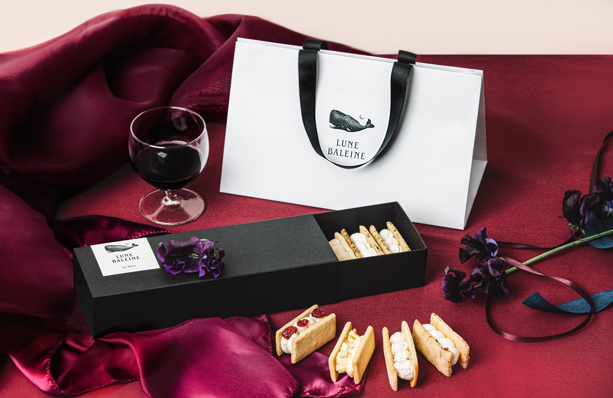 『LUNE BALEINE』は、“お酒を愉しむ“というコンセプトから生まれたバターサンドです。 “お酒を愉しむ“ゆるりとした時間を通して感じる、心も体もほぐれた“ほろ酔い“の感覚は、まるで水中で浮遊しているようなリラックス感があります。手のひらサイズのバターサンドに、神秘的で安らぎを感じられる、おおらかな鯨のイメージを重ね合わせることで「より豊かで特別な時間になりますように」という想いを込め、2023年6月にブランドを開始。第1弾「Parasol(パラソル)」シリーズでは、クランベリーカシス・オレンジブランデー・サーモンケッパー・エダムの計4種類、2023年9月からは新フレーバー「La Terre(ラ・テール)」シリーズの4種類を加え、計8フレーバーで展開しています。