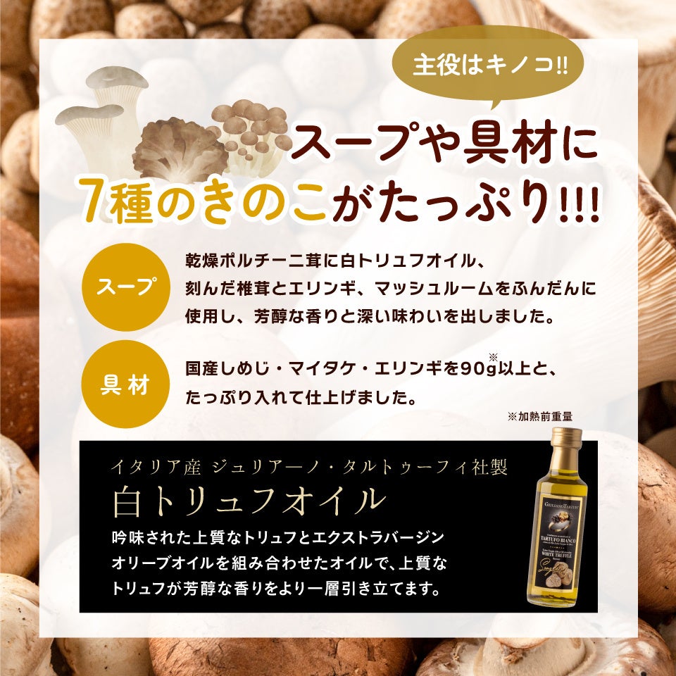 『~ポルチーニ茸&トリュフ香る~濃厚きのこポタージュトマト麺』の主役は、スープや具材にたっぷりと入った7種のきのこです。特製スープには乾燥ポルチーニ茸に白トリュフオイル、刻んだ椎茸とエリンギ、マッシュルームをふんだんに使用し、芳醇な香りと深い味わいを出しました。具材にも、国産しめじ・マイタケ・エリンギが90g(※加熱前重量)とたっぷりトッピング。白トリュフオイルは、イタリア産ジュリア―ノ・タルトゥーフィ社製のもの。吟味された上質なトリュフとエクストラバージンオリーブオイルを組み合わせたオイルで、上質なトリュフが芳醇な香りをより一層引き立てます。