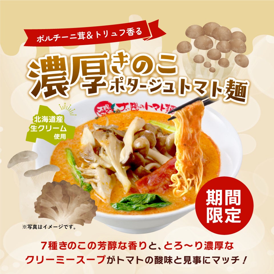 『~ポルチーニ茸&トリュフ香る~濃厚きのこポタージュトマト麺』は、7種のきのこの芳醇な香りと、とろりと濃厚なクリーミースープがトマトの酸味と見事にマッチした、トマトラーメンです。2018年秋、「太陽のトマト麺」の店舗で期間限定メニューとして登場し、3ヶ月で27,000食以上売り上げた人気メニューで、復刻の声も多く、このたび通販サイト限定で期間限定発売をすることとなりました。