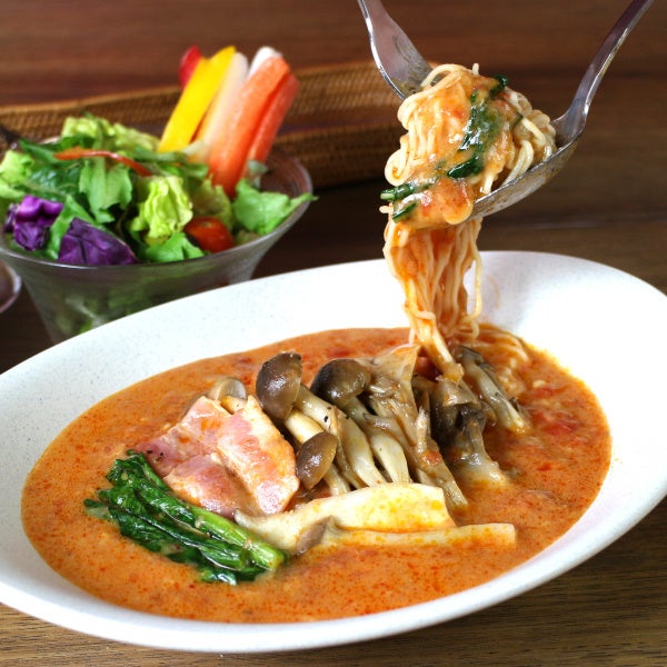 お好みの野菜を添えたり、バゲットをスープに浸して食べたり。ワインと合わせてちょっとリッチに。ご自宅だから叶う、太陽のトマト麺のアレンジをお楽しみいただけます。